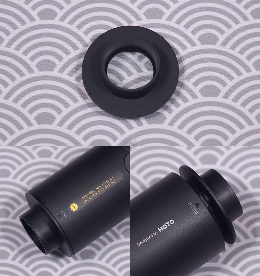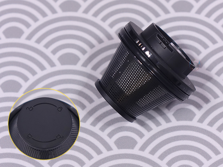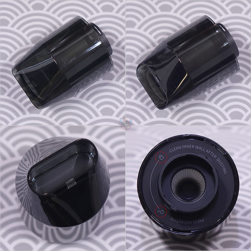 이번에 몸체에 연결되는 각 커넥터들을 살펴보는데, 먼저 청소 흡입구에 연결되는 커넥터에는 먼지통(Dust cup)과 분리형 브러시 진공 헤드(Movable brush vacuum head) 2가지 제공됩니다.물론, 먼지통에 분리형 브러시 진공 헤드를 연결해서 사용하는 것이고, 기본적으로 먼지통에도 흡입구가 있기때문에 먼지통만 연결해서 사용해도 됩니다. 먼지통 같은경우에는 정확히 용량 표기가 없지만, 대략 30~40ml 용량정도 크기이며, 내부에 헤파-필터(HEPA Filter)가 적용되어 있는데, 후면에서 안쪽으로 누르면서 표시된 잠금/풀림 방향으로 돌리면 쉽게 장착/분리할 수 있습니다. 또한, 분리된 헤파필터는 바깥쪽 메쉬(Mesh)부분이 메탈(Metal) 재질이며, 역시 안쪽에 표시된 잠금/풀림 표시대로 움직이면 메쉬 메탈부분과 헤파필터를 따로 분리할 수 있습니다.