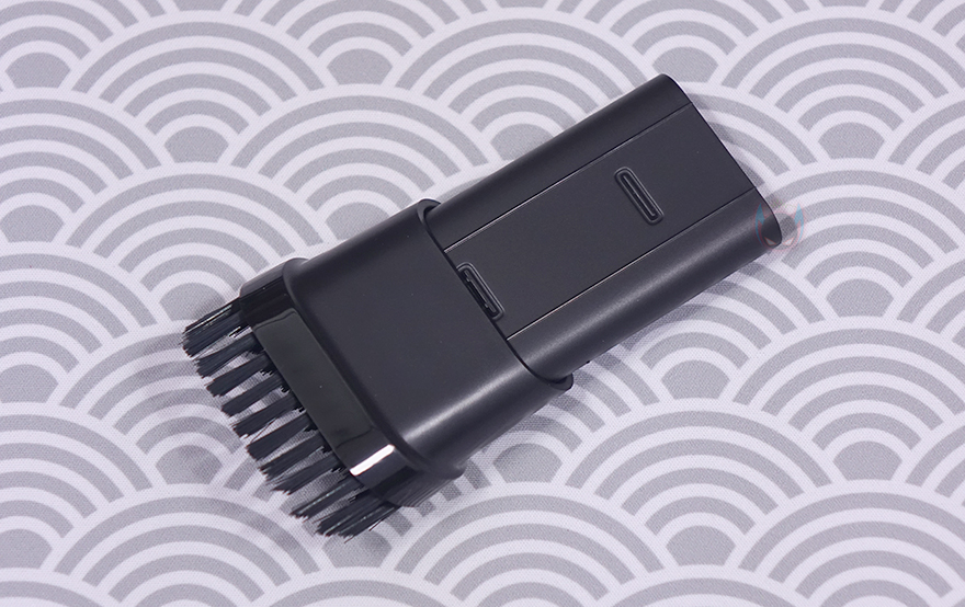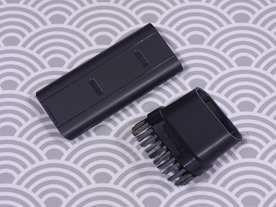 그리고, 마지막으로 공기를 빼주는 진공 수축 커넥터(Vacuum deflating connector)도 제공을 해주는데, 기본적으로는 흡입구쪽에 연결해서 공기가 들어있는 물체의 공기를 빼낼 때 사용하지만, 후면 배출구에도 연결해서 사용해도 상관없습니다. 예를 들어 지퍼백 같은 비닐 주머니에 공기를 뺄 때나 공기를 불어넣을 때 둘 다 가능하다는거죠. 물론, 공기를 빼낼 때는 내부에 먼지나 가루 같은 불순물이 있으면 안됩니다. 먼지통을 연결해서 사용하는게 아니라서 불순물이 흡입되면 내부 모터 고장에 원인이 될 수 있습니다. 쉽게 말해 진공 포장 같은 작업을 할 때만 사용하는거죠. 끝으로, 기본 제공되는 USB 충전케이블은 USB Type-A to C 인터페이스를 가졌으며, 사용하지 않을 때 보관할 수 있는 전용 파우치는 내부에 작은 주머니가 들어있어서 몸체와 커넥터들을 따로 담아서 보관할 수 있습니다.