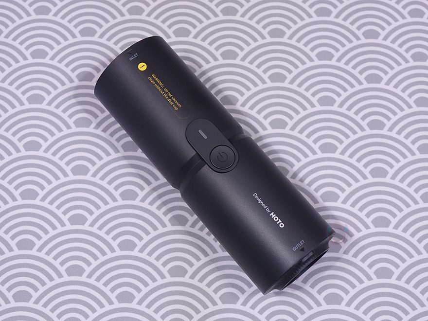 그럼, HOTO(호토)의 압축 공기 캡슐 헨드헬드 진공 청소기(Compressed Air Capsule) 본체인 바디(Body)부터 살펴보는데, 몸체 길이는 163.5mm로 앞서 잠깐 언급했듯이 휴대용으로 한손이 잡기 편한 길이를 가졌습니다. 참고로, 지름도 56mm로 한손 그립이 편한 굵기를 가졌으며, 무게는 약 361g으로 역시 휴대하기에 부담되지 않는 무게를 가졌죠. 몸체 정가운데는 전원 버튼(Power button)과 바로 위에 배터리 상태를 확인할 수 있는 LED 인디케이터(Indicator)가 적용되어 있습니다. 그리고, 이 버튼 위치를 기준으로 앞쪽으로는 청소용으로 사용되는 흡입구(Inlet)가 적용되어 있는데, 그릴 디자인에 안쪽으로 메쉬 디자인이 적용된 것을 확인할 수 있습니다.