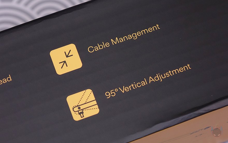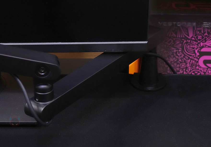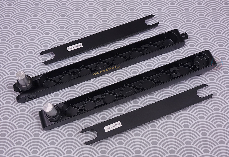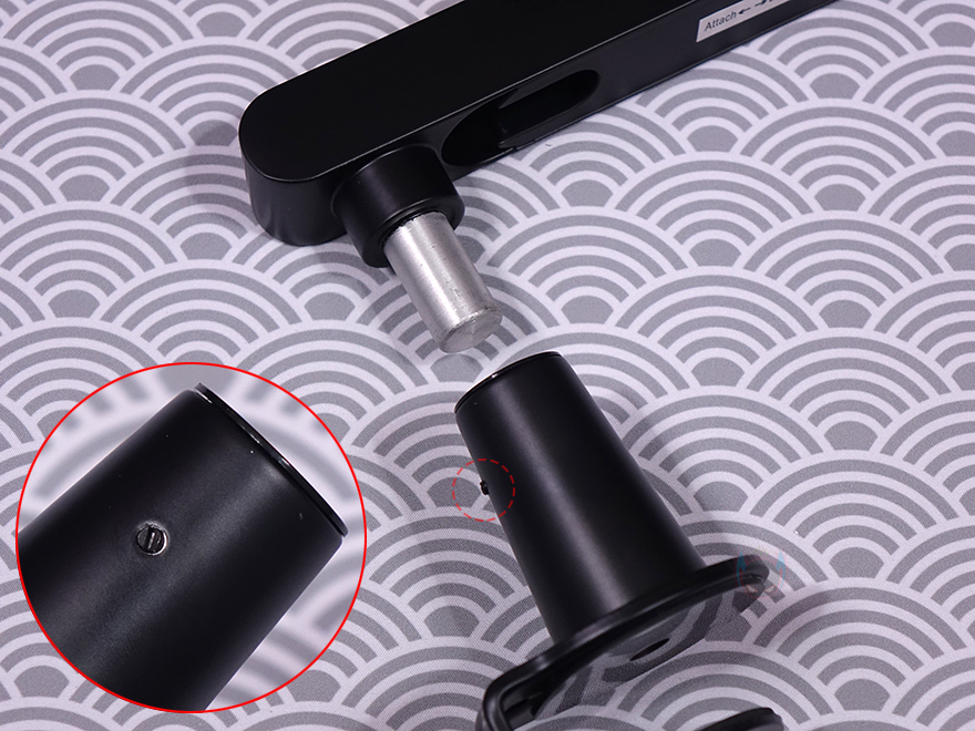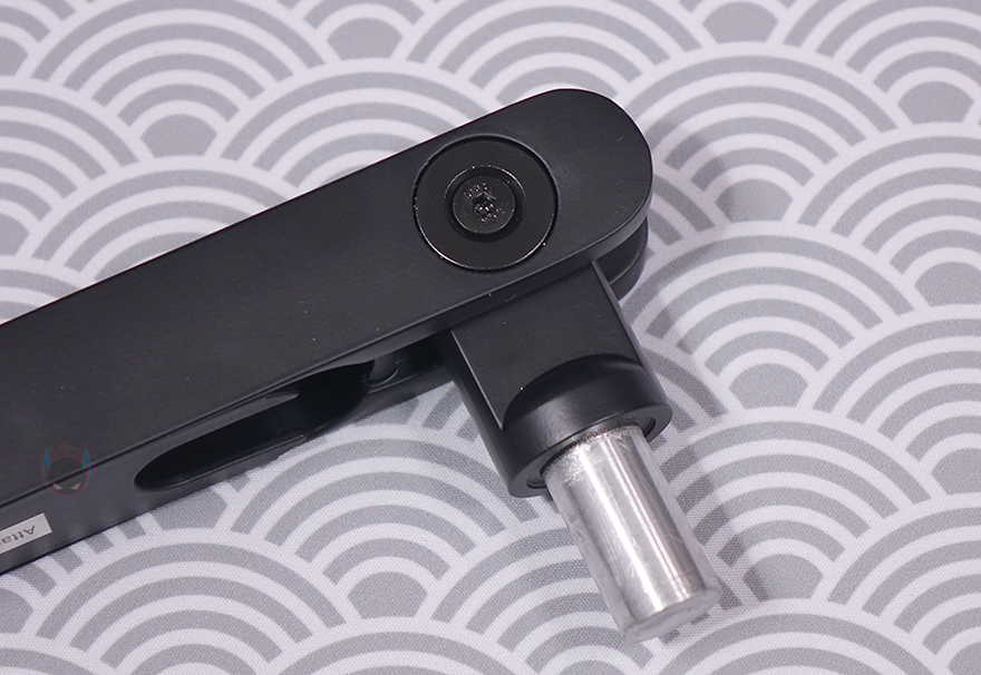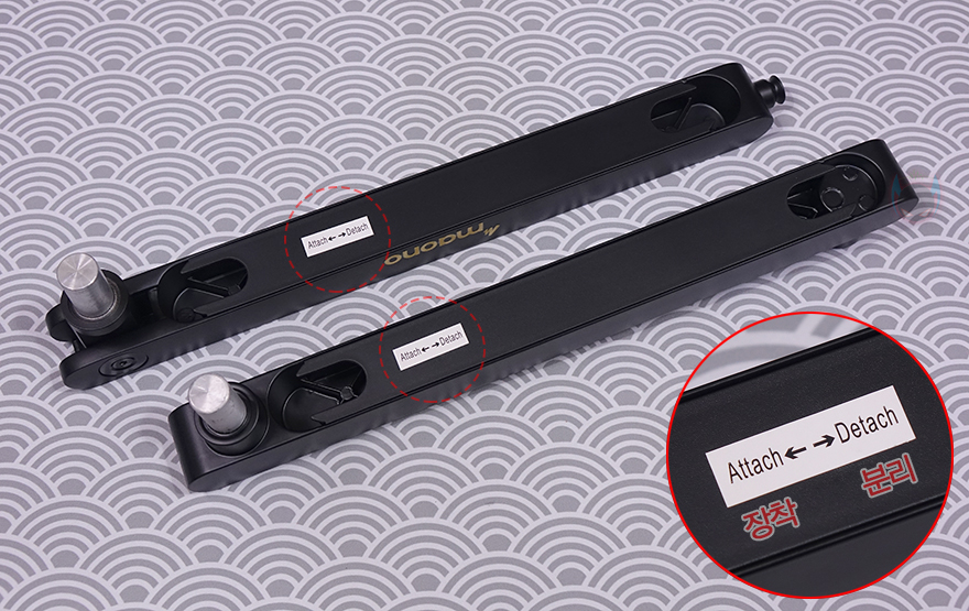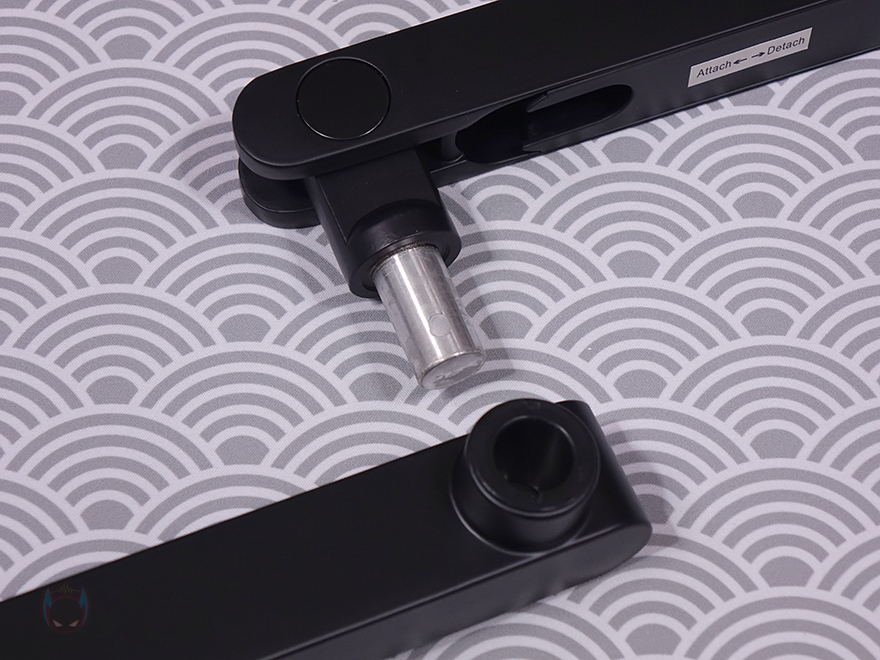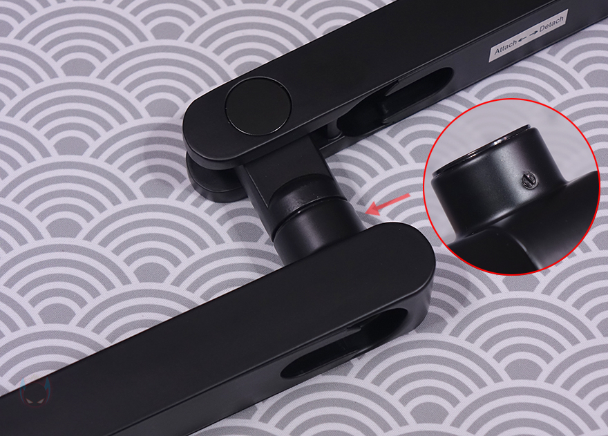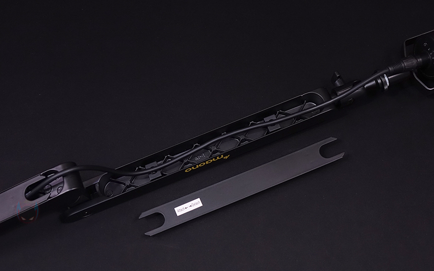 그리고, 두 암 모두 밑부분에는 케이블을 정리할 수 있는 홈이 있는데, 케이블을 가릴 수 있게 홈-커버를 적용하고 있으며, 표시된 방향으로 커버를 장착/분리할 수 있습니다. 밀어서 끼우는 방식이라 편리합니다. 그리고, 상단과 하단 암을 결합했을 때 역시 회전 압력을 조절할 수 있게 하단 암 홈 측면에는 나사가 적용되어 있으며 제공되는 렌치로 조절하면 됩니다.