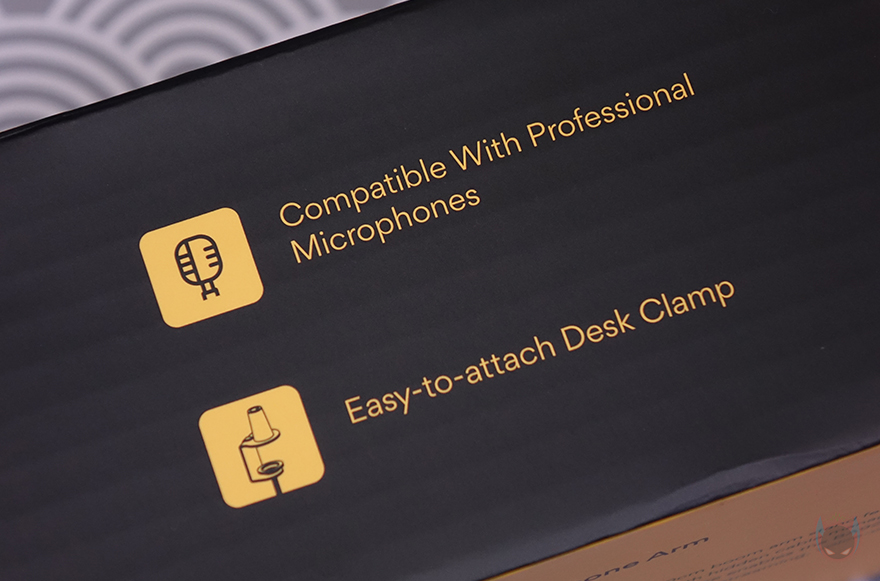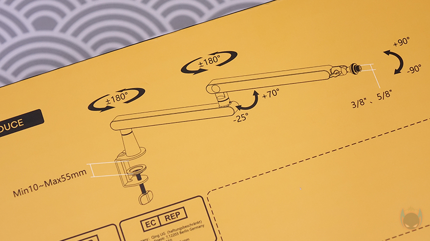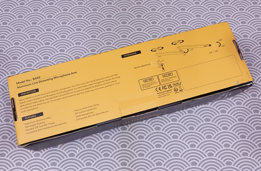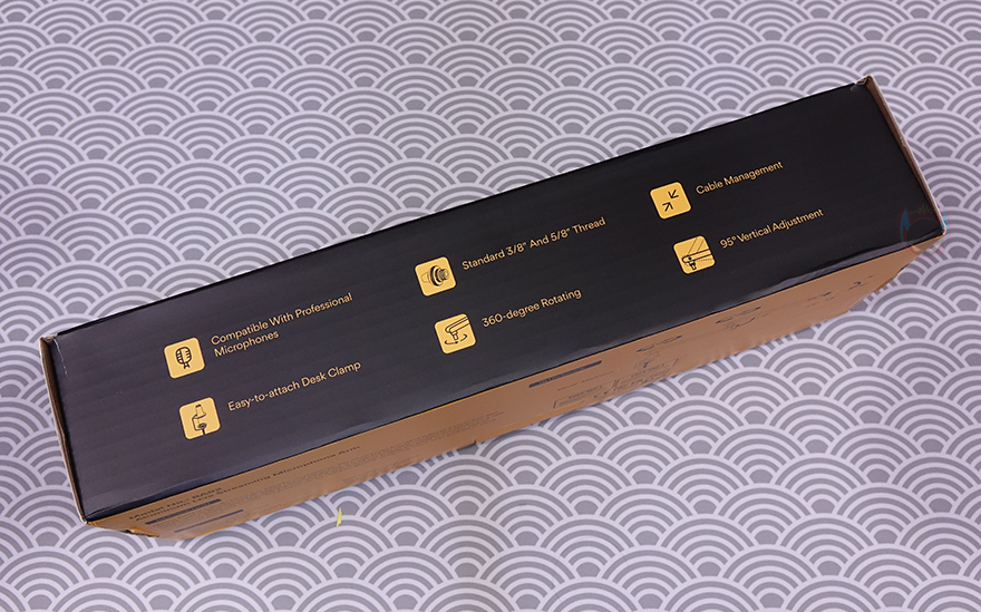 제품박스부터 살펴보면, 모델명과 함께 BA92 마이크 붐 암(Microphone Boom Arm)의 제품 이미지가 바로 담겨있어서, 쉽게 어떤 마이크 붐 암인지 짐작할 수 있습니다. 바로, 로우-프로파일(Low Profile) 마이크 붐 암이죠. 기본적으로 낮은 높이를 가지면서 자유롭게 회전하고 상하 위치를 움직일 수 있는게 로우-프로파일 마이크 붐 암입니다. 이는 박스 측면에도 주요 특징 중 하나로 표기하고 있는데, 다양한 마이크 연결호환성부터 손쉬운 설치, 3/8"인치와 5/8"인치 어댑터, 360˚ 회전, 케이블 정리, 총 95 ˚ 범위의 각도조절을 주요 특징으로 표기해 놨습니다.