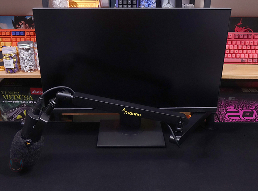그리고, 기본적으로 이런 낮은 높이를 가진 마이크 붐 암의 최대 장점은 바로 공간차지와 간섭이 적다는 거죠. 특히, 모니터 테이블 공간을 많이 차지하는 만큼 일반적인 마이크 붐 암까지 사용하면 더 공간을 차지하게 되는데, BA92처럼 로우 프로파일 마이크 붐 암이면 기본 높이가 63mm부터 시작하기 때문에 모니터 공간 아래에 설치해서 자유롭게 마이크를 사용할 수 있습니다. 또한, 케이블정리도 앞서 확인했듯이 암 아랫부분 공간에 정리되기 때문에 깔끔함도 함께 갖추게 되죠.