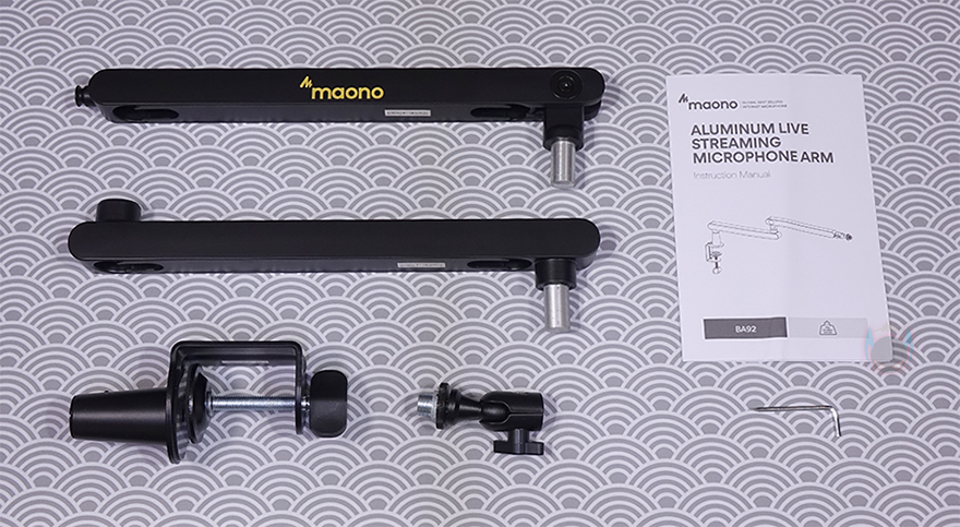 그리고, 박스 후면에는 MAONO(마오노) 특징인 모든 제품의 소개문구를 BA92 역시 박스 후면에 담고 있으며, 방금 언급했던 주요 특징 표기와 추가로 오른쪽에 제품 이미지와 함께 각도와 회전 범위를 손쉽게 이해하도록 담고 있습니다. 박스를 열어보면, 포장은 구성품마다 모두 비닐포장으로 처리되어 있으며, 전체 구성은 상/하로 분리되는 암 2개, 클램프, 볼헤드, 렌치, 제품설명서로 이루어져 있습니다.