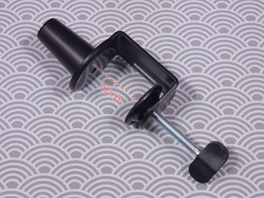 마이크를 장착할 수 있게 해주는 볼-헤드는 마이크 연결부의 기본 나사 규격은 3/8"인치지만, 5/8"인치 어댑터가 함께 제공되기 때문에 두 가지 규격으로 마이크 장착을 할 수 있으며, 앞서 확인한 상단 암 연결부에 볼-헤드를 풀어서 끼우고 다시 체결하는 방식으로 연결은 어렵지 않습니다. 클램프 역시 기존의 마이크 붐 암에서 흔히 볼 수 있는 클램프 형태로 두께 범위는 10~55mm이며, 최대 벌렸을 때는 약 57mm입니다. 물론, 상하 안쪽으로 접지력과 테이블 훼손방지를 위한 패드가 부착되어 있죠. 그리고, 역시 하단 암과 연결했을 때 홈 부분에는 회전 압력조절을 할 수 있게 측면에 나사가 적용되어 있습니다.