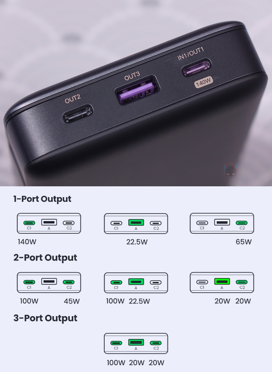 그리고, 145W 25,000mAh 보조배터리에는 총 3개의 포트가 적용되어 있는데, USB Type-C 포트가 2개, Type-A 포트가 1개입니다. Type-C 포트 같은 경우에는 1개가 입/출력 둘 다 지원하는 포트인 동시에 단일 최대인 140W 출력을 하는데, 소비자가 쉽게 알 수 있도록 표기해 놨죠. 그리고, Type-A 포트는 최대 22.5W를 출력합니다. 또한, PD 3.1 규격을 가졌기 때문에, Type-C 포트 2개를 동시에 사용해도 각각 100W와 45W로 일반 100W 보조배터리보다 높은 속도를 자랑합니다. 특히 눈여겨볼 부분은 3개 모두 사용해도 140W 출력의 Type-C 포트는 100W를 유지한다는 거죠. 하나는 고속충전을 유지하면서 나머지 2개는 가장 낮은 고속충전 20W를 출력하기 때문에 최신 충전지원 전자제품부터 예전 고속충전 지원의 전자제품들까지 모두 사용할 수 있습니다. 또한, 뒤에서 확인하겠지만, 앞서 주요 특징에서 언급했듯이 버튼 설정을 통해서 스마트워치나 무선이어폰 등 5~10W 저속 충전을 지원하는 전자제품들도 충전할 수 있죠.