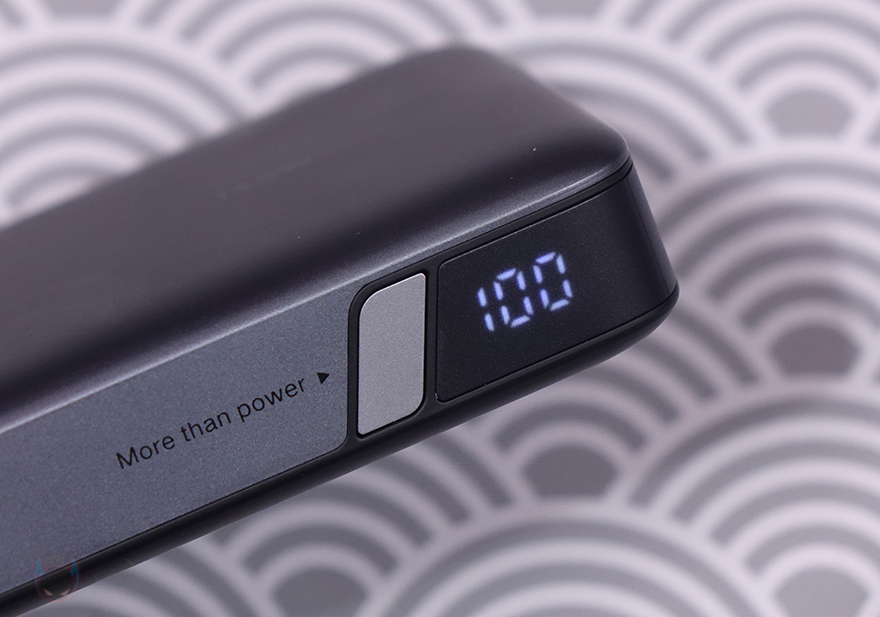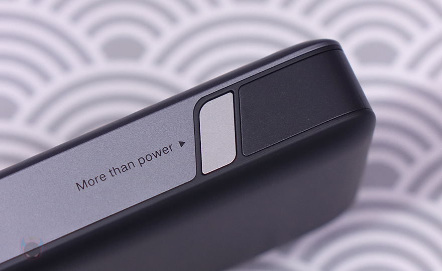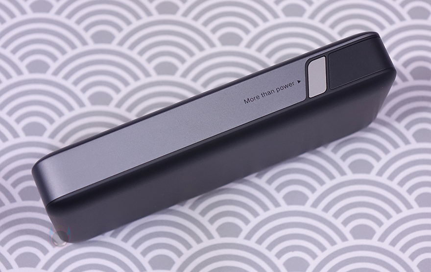 배터리 한쪽 측면에는 배터리 용량 표기와 함께 앞서 제품 박스에서 확인한 각 포트별 출력속도 표기를 다시 확인할 수 있으며, 반대쪽 측면에는 역시 주요 특징 표기에서 확인했던 작동 상태를 확인할 수 있는 스마트 LED 디스플레이가 적용되어 있는데, 회색 버튼을 통해 오른쪽에 LED가 켜집니다. 평소 Off 상태일 때는 주변 디자인과 이질감이 생기지 않도록 잘 처리되어 있죠. 그리고, 제품 바닥면도 무광에 고무코팅처럼 부드러운 표면처리를 해놨습니다.