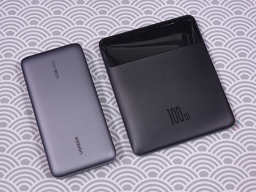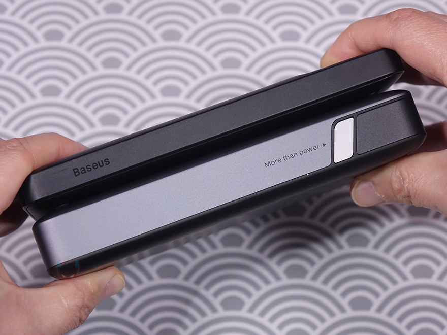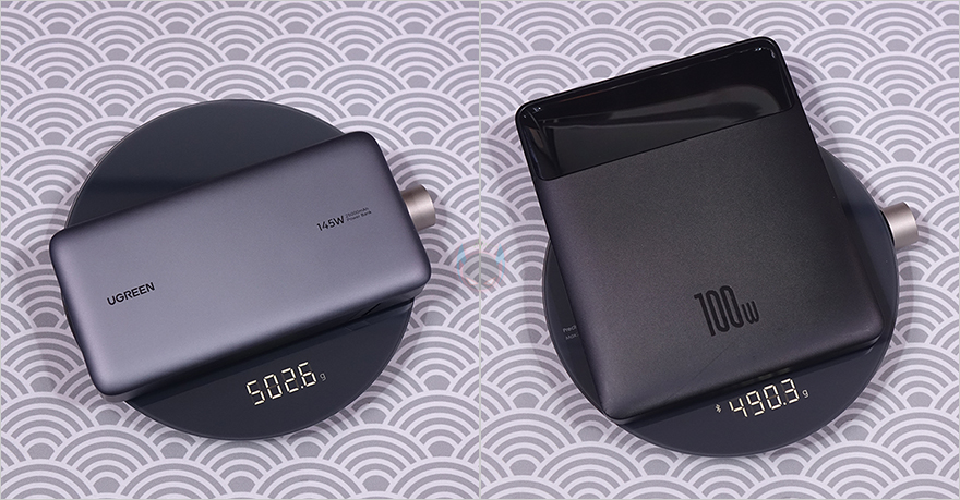 실제로 국내에서도 인기가 많은 대표적인 100W 20,000mAh 보조배터리 제품과 비교해 보면, 면적은 145W 25,000mAh 보조배터리가 절반정도 작고, 두께는 18mm와 27mm로 1.5배 정도 두껍습니다. 무게도 당연히 5,000mAh 용량 더 많기 때문에 10g 정도 더 나가죠. 하지만, 휴대성으로 볼 때는 큰 차이가 없기 때문에 더 빠른 고속충전 보조배터리 원한다면 충분히 145W 25,000mAh 보조배터리를 선택할 수 있습니다.