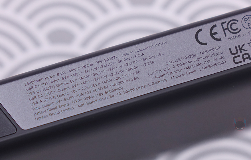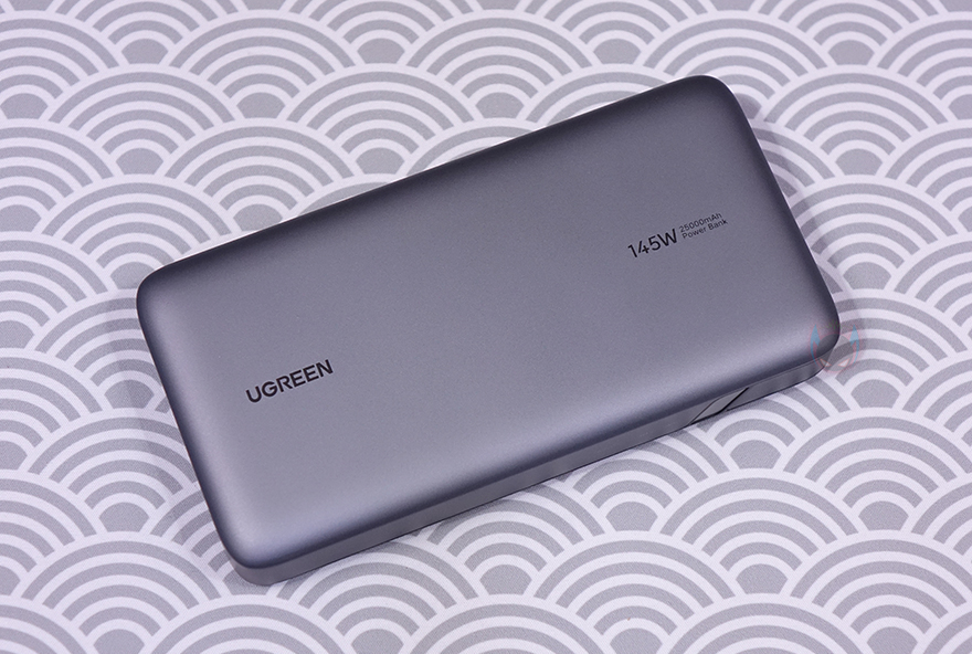 본격적으로 유그린(UGREEN)의 145W 25,000mAh 보조배터리(PB205)를 살펴보면, 제품 상단 표면은 메탈 스프레이 페인트 처리로 금속 느낌을 표현했으며, 왼쪽 UGREEN 로고와 함께 반대쪽 오른쪽에는 145W 25000 mAh Power Bank 표기를 해놨습니다. 참고로, 이 제품이 나오기 전에 동일한 디자인으로 100W 20,000mAh 보조배터리 제품이 먼저 나왔는데, 100W 20,000mAh 보조배터리 모델명은 PB207로 구분하고, 보조배터리 충전속도는 65W로 동일하지만, 100W 20,000mAh 보조배터리는 PD 3.0 규격이고, 145W 25,000mAh 보조배터리는 PD 3.1 규격이기 때문에 최대 출력 충전속도에서 145W 25,000mAh 보조배터리가 더 빠르고, 나머지 일부 포트에서도 속도차이가 있어서 총 출력 충전속도도 145W 25,000mAh 보조배터리가 빠르죠. 또한, 내장된 배터리 셀은 이미 전기차로 유명한 테슬라에 사용되는 배터리 셀과 동일합니다.