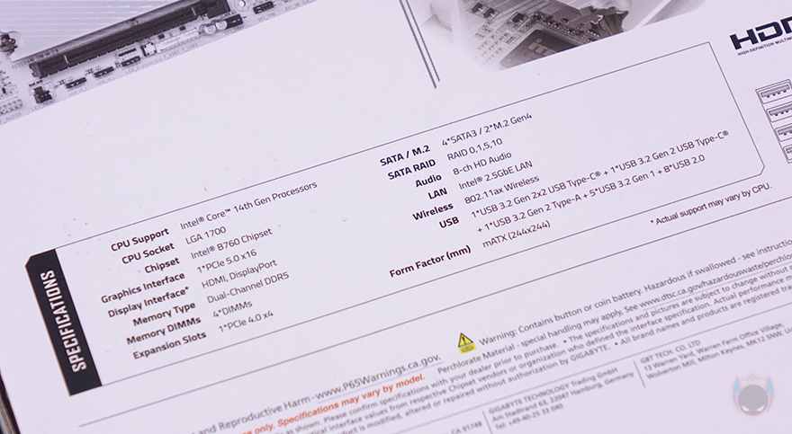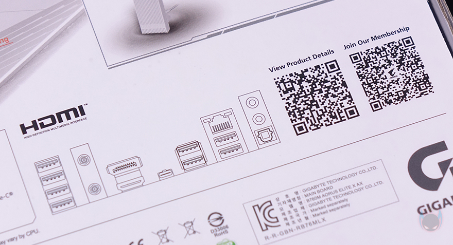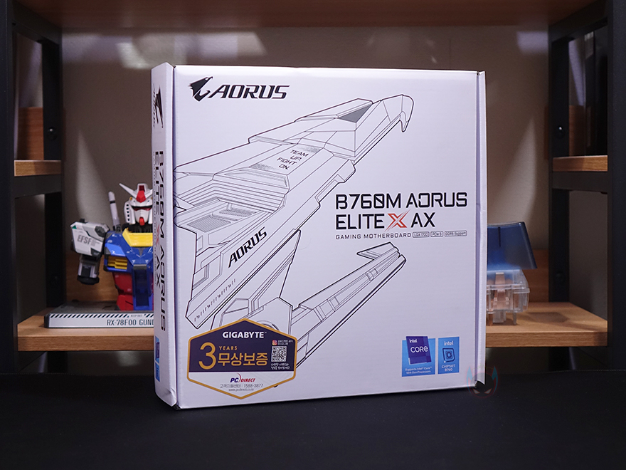 제품박스부터 살펴보면, 박스 색상부터 화이트 색상으로 갖추고 있어서 누가봐도 이 제품은 화이트색상 제품이라는 걸 알 수 있죠. 참고로, B760M AORUS ELITE X AX 메인보드뿐만 아니라 함께 출시한 다른 화이트 메인보드 제품들 역시 박스 색상이 화이트입니다. 그리고, 먼저 나왔던 기본 모델의 어로스 엘리트 제품 박스와 비교해 보면 디자인은 색상을 제외하고 차이가 없다는 것도 쉽게 알 수 있죠. 박스 전면에는 모델명과 함께 인텔 14세대 프로세서 지원, 국내 정식 수입사인 (주)피씨디렉트의 3년 무상보증 스티커를 확인할 수 있으며, 측면에도 간략하게 한국어를 포함한 다국적 언어로 제품 콘셉트 문구를 표기해 놨습니다.