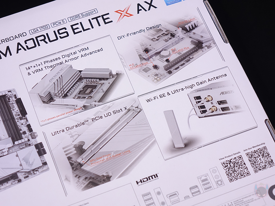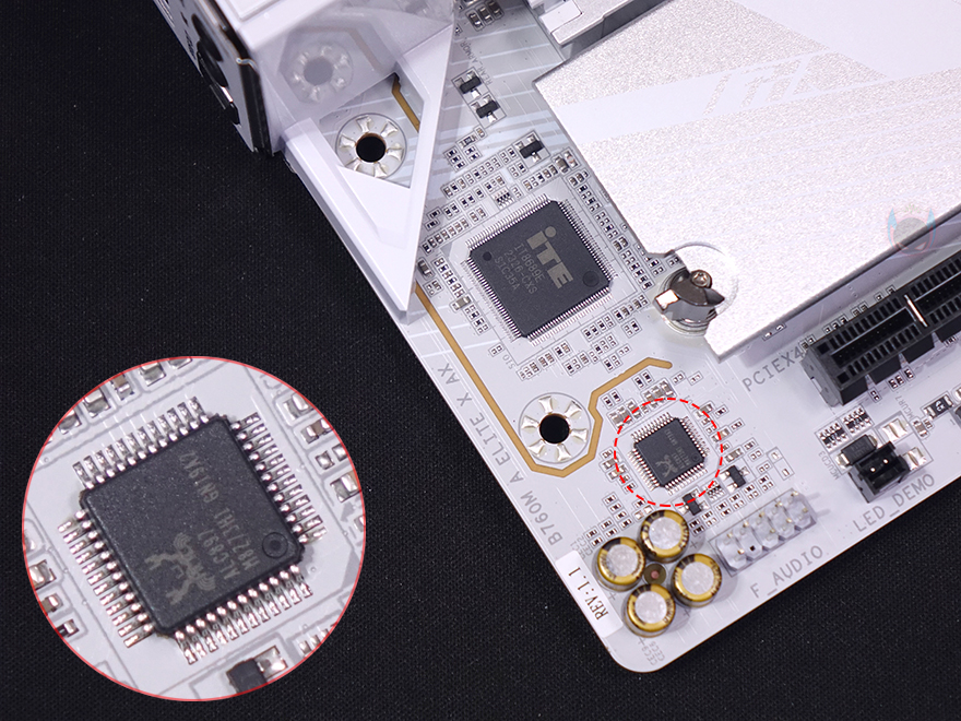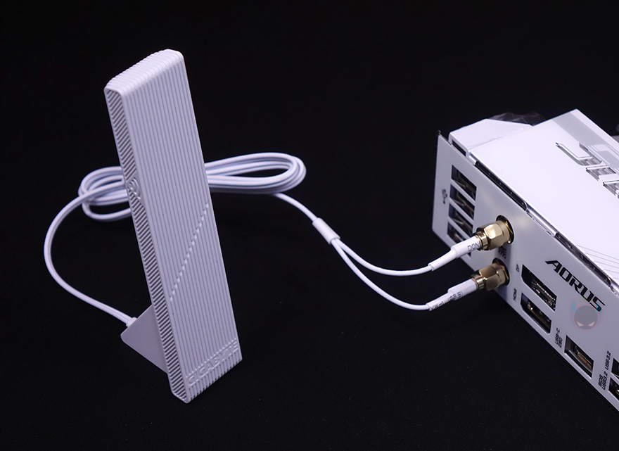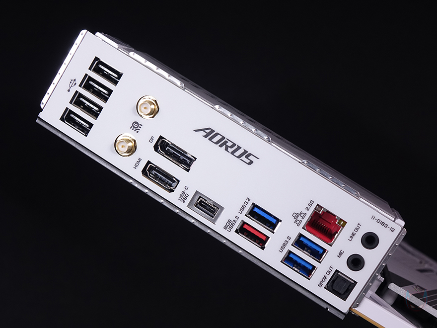 PCIe 슬롯 기준 왼쪽으로는 내장 오디오 구간으로 독립 PCB구간으로 처리했으며, 오디오 칩셋은 리얼텍(Realtek)사입니다. 끝으로, 백패널 I/O 포트 부분에는 I/O 실드가 기본 장착되어 있으며, 포트 구성에는 USB 2.0/1.1 포트 4개, USB 3.2 Gen2x2 Type-C 포트, USB 3.2 Gen1(파란색) 포트 2개, USB 3.2 Gen2(빨간색) 포트 1개, 모니터 출력에 HDMI, DP, 2.5G 랜포트, 오디오단자, 광 S/PDIF 출력커넥터가 적용되어 있습니다. 그리고, 모니터 출력포트 바로 위에는 B760M AORUS ELITE X AX 메인보드가 무선 Wi-Fi 지원의 AX 라인업이기 때문에 안테나 커넥터가 배치되어 있죠. 물론, 앞서 구성품에서 확인했듯이 Wi-Fi 안테나는 기본 제공이며, 역시 화이트 콘셉트에 맞춰서 화이트 색상으로 디자인되어 있습니다. 참고로, Wi-Fi 규격은 Wi-Fi 6E입니다.