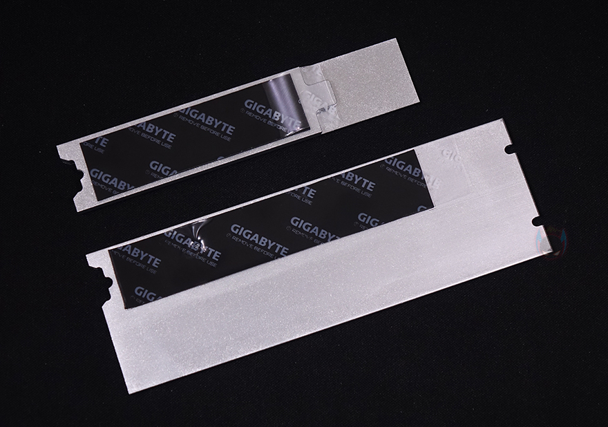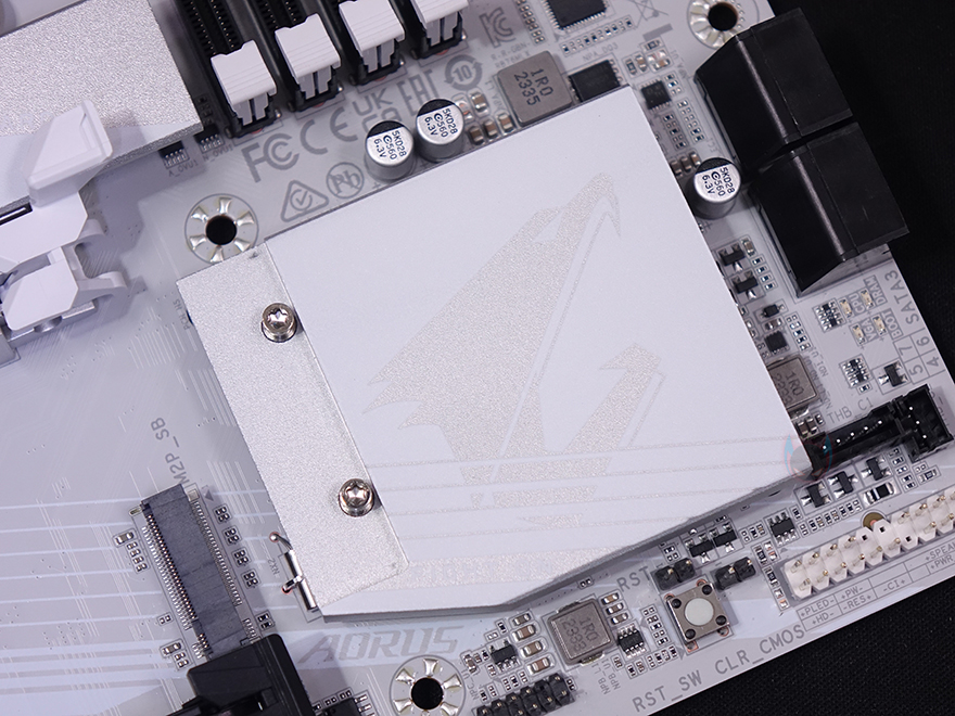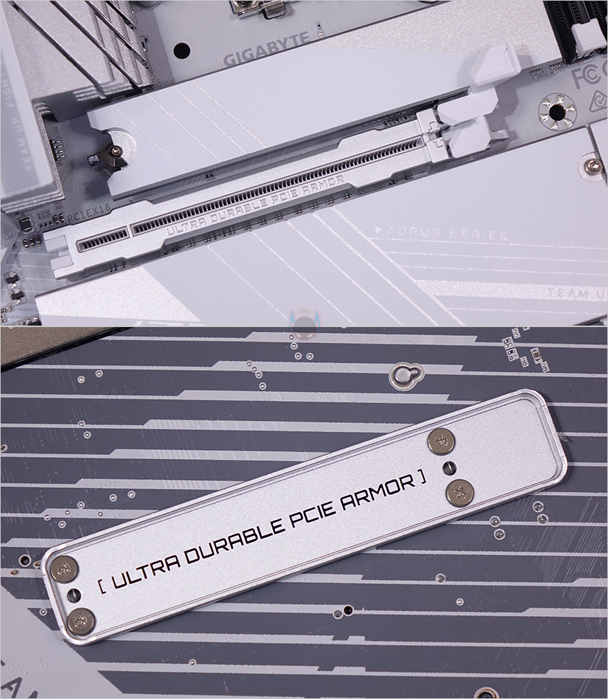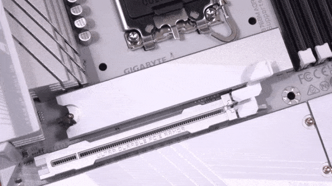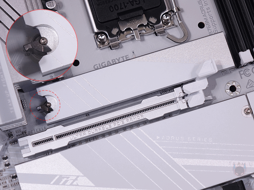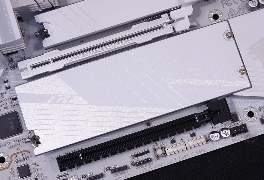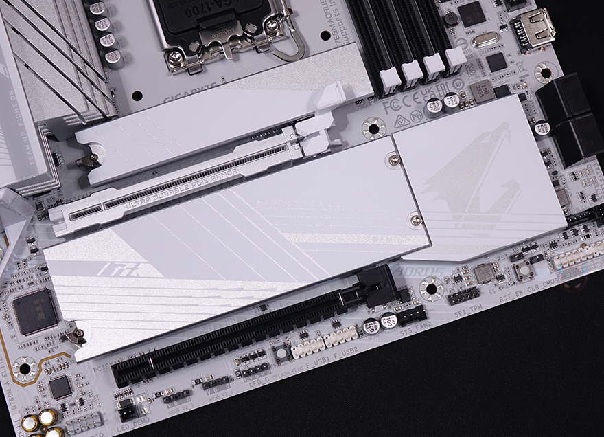 PCIe 슬롯 같은 경우에는 기본 모델과 마찬가지로 B760M AORUS ELITE X AX 역시 2개를 갖추고 있으며, 대신 PCIe 슬롯 사이에 배치되는 M.2 SSD 슬롯 2번 자리에는 기본 모델에선 없었던 히트싱크가 추가되었습니다. 그리고, 그래픽카드가 장착되는 1번 PCIe 슬롯 위에는 M.2 SSD 슬롯 1번 자리로 공구 없이 히트싱크와 SSD를 장착할 수 있는 EZ-Latch Plus가 적용되었으며, 바로 아래 1번 PCIe 슬롯 역시 그래픽카드를 손쉽게 분리할 수 있는 EZ-Latch가 적용되었고, 색상도 화이트로 적용했습니다. 또한, 1번 PCIe 슬롯은 내구성 강화를 위해 주변 마감을 아마(Armor) 커버로 처리했으며, 후면에도 백플레이트를 적용했습니다. 그리고, PCIe 슬롯 사이에 배치된 M.2 SSD 2번 슬롯 자리에 히트싱크 역시 EZ-Latch Plus가 적용되어 무나사로 분리 및 장착이 가능하고, M.2 SSD 슬롯 히트싱크에는 모두 안쪽에 기본 써멀패드가 부착되어 있습니다. 참고로, M.2 SSD 규격은 PCIe 4.0x4레인까지 지원합니다.