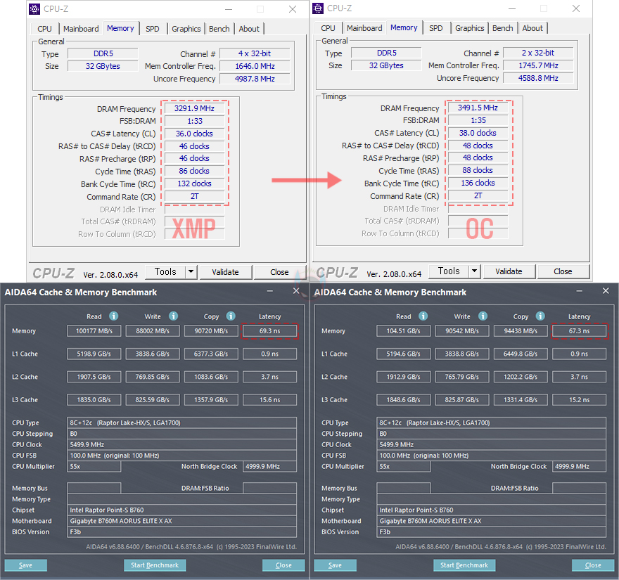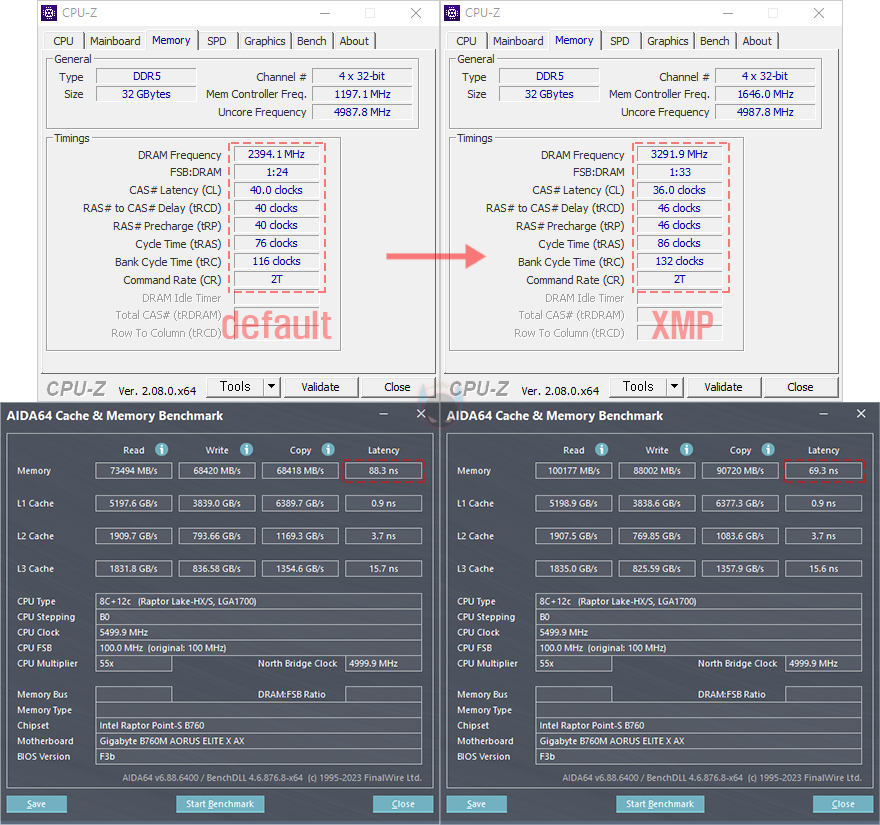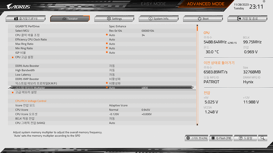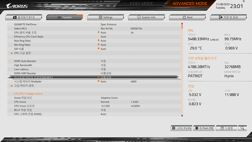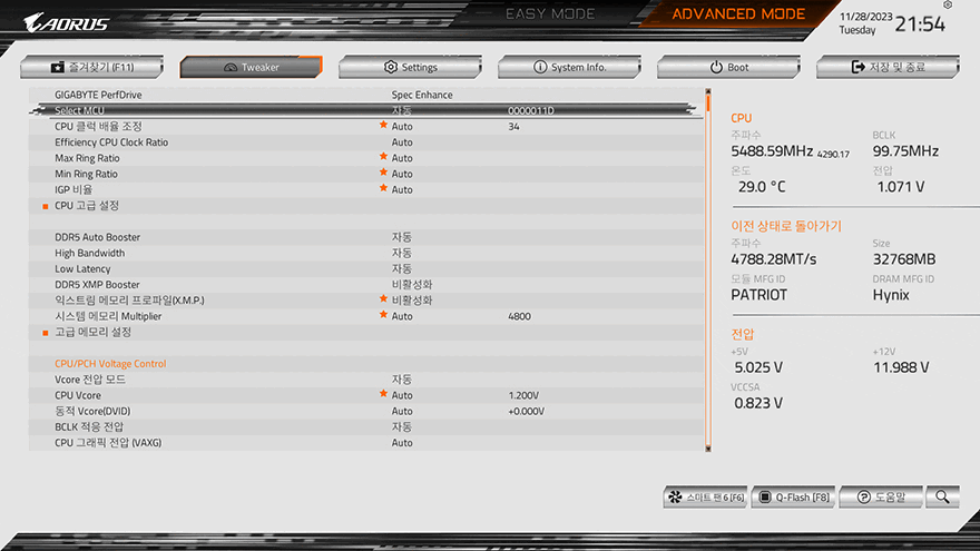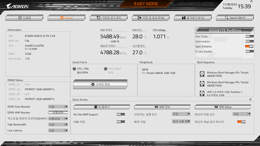 B760M AORUS ELITE X AX 메인보드의 일부 성능을 알아보기 전에 CMOS 메뉴를 잠깐 살펴보면, 일단 CMOS 인터페이스 역시 화이트 콘셉트 제품에 맞춰서 배경색상을 화이트계열 색상으로 변경했습니다. 기존 기가바이트에 화이트 제품군 메인보드라 할 수 있는 AERO 라인업 메인보드 CMOS에 이어 두 번째 화이트 인터페이스라 할 수 있죠. 그리고, 역시 F2키를 사용해 EASY 모드와 Advanced 모드로 전환할 수 있는데, EASY 모드는 전체적인 시스템 모니터링을 한 화면에 볼 수 있고, 메모리 오버클럭이나 전압 설정은 세부적인 설정을 다룰 때는 Advanced 모드에서 합니다. Advanced 모드에서 메뉴 역시 기존 제품들과 큰 차이 없이 즐겨찾기/Tweaker/Setting/System Info/Boot/저장 및 종료 6가지 메뉴로 분류되죠.