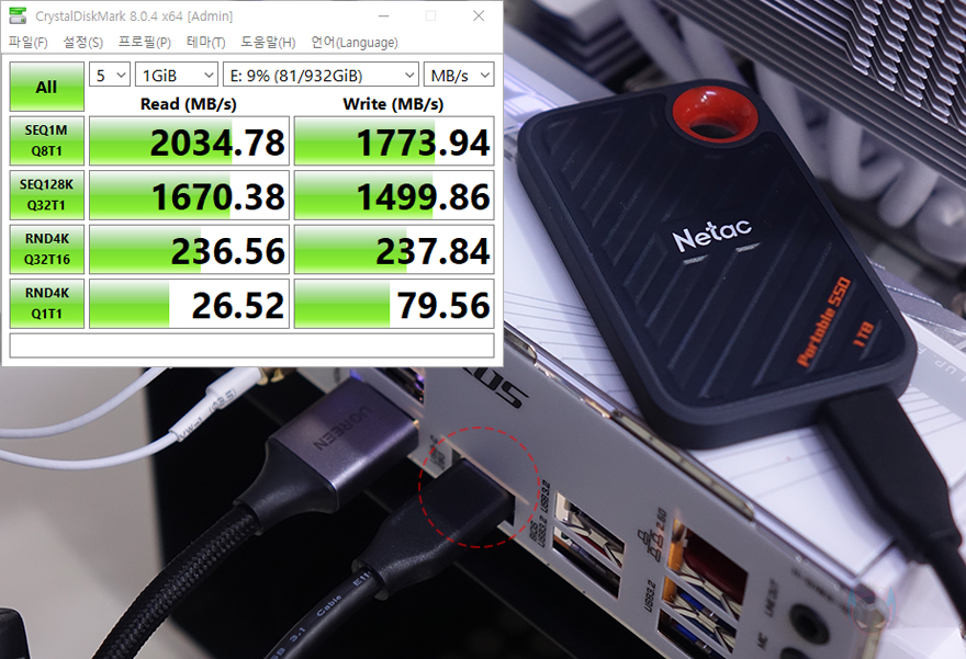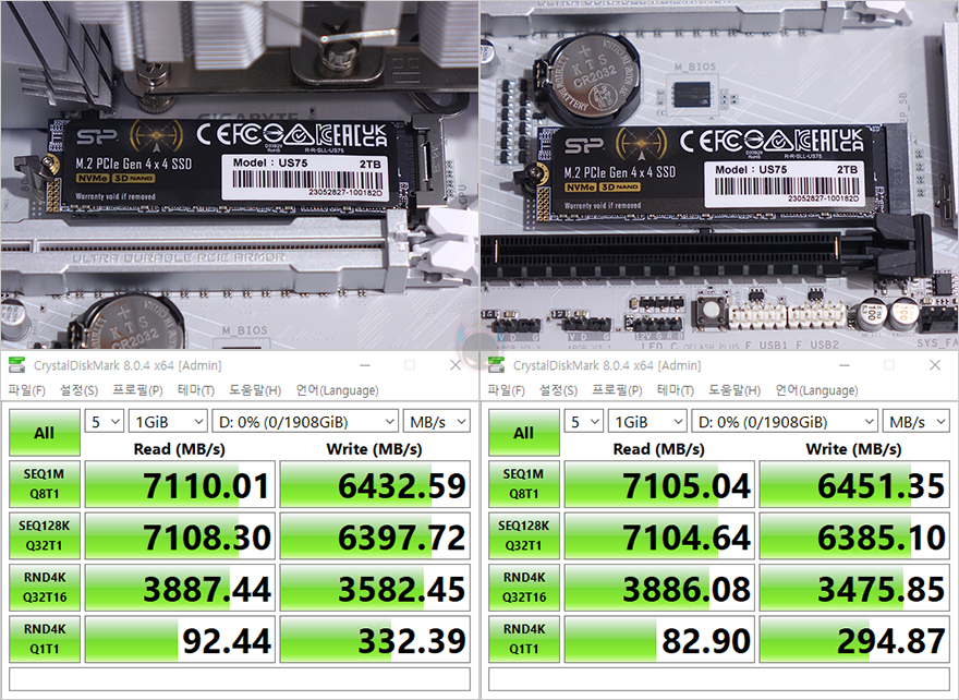이번엔 B760M AORUS ELITE X AX 메인보드에 있는 M.2 SSD 슬롯에 성능을 확인해 보는데, 앞서 언급했듯이 2개의 M.2 SSD 슬롯 모두 PCIe 4.0x4레인 규격까지 지원하며, 이를 지원하는 NVMe SSD를 장착하면, 최대 읽기 7000MB/s, 최대 쓰기 6500MB/s대가 나옵니다. 실제로, B760M AORUS ELITE X AX 메인보드 M.2 SSD 슬롯 1번과 2번에 PCIe 4.0x4 규격 NVMe SSD를 장착해서 읽기와 쓰기 속도를 확인해 보면, 최대 속도에 근접하는 결과값을 확인할 수 있죠. 또한, 백패널 I/O 포트에 있는 USB 3.2 Gen2x2 Type-C 포트 역시 규격에 맞는 외장 SSD를 사용했을 때, 최대치 속도인 2000MB/s대에 근접한 성능을 보여줍니다.