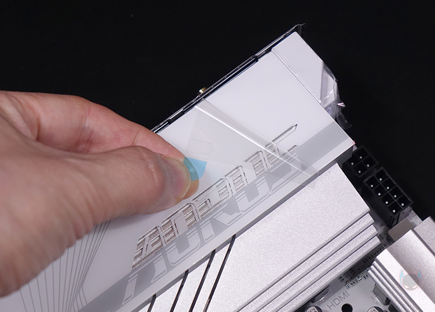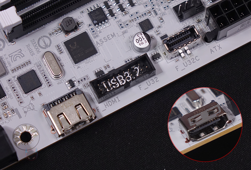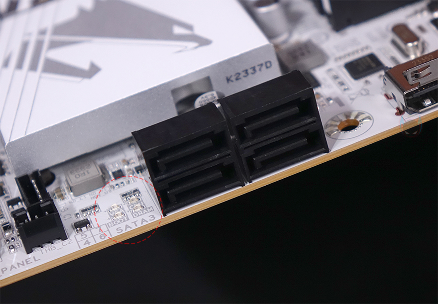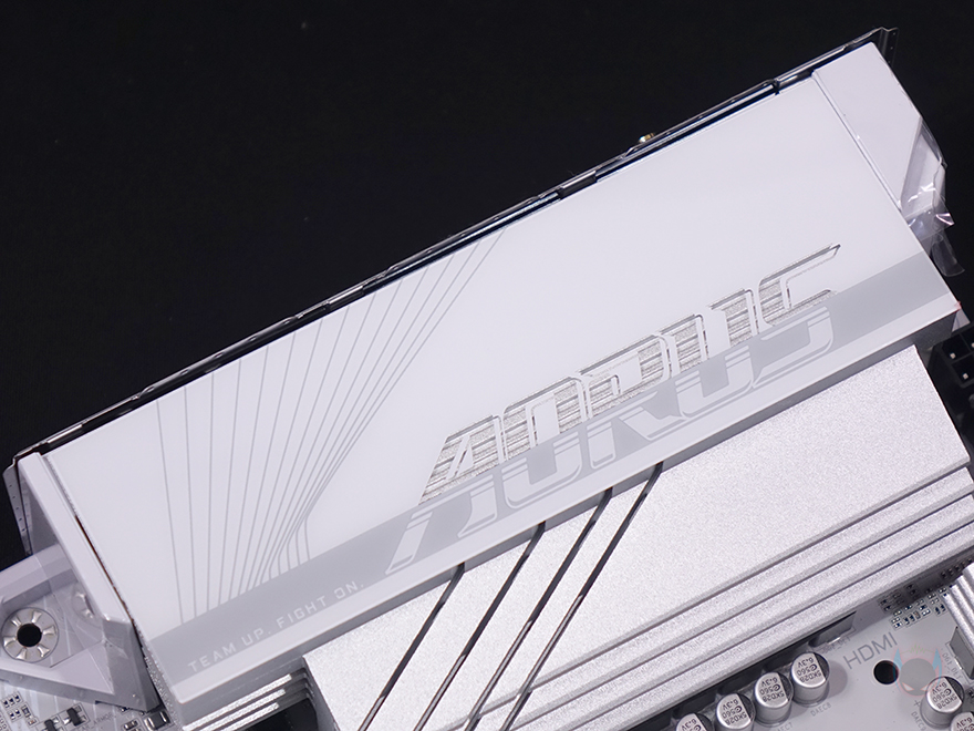 메모리 슬롯은 DDR5 지원에 총 4개 슬롯 구성으로 화이트 콘셉트에 최대한 맞추기 위해 양쪽 메모리 고정장치도 화이트 색상으로 적용했습니다. 메모리 용량은 최대 192GB까지 지원하며, 클럭은 B760 칩셋에서 메모리 오버클럭이 가능하기 때문에 8266MHz이상까지 지원해주고 있습니다. 그리고, 주변에는 5V ARGB 헤더를 비롯해 USB 3.2 Gen1 내부헤더와 USB 3.2 Gen2 Type-C 내부헤더(A타입)가 배치된 것을 확인할 수 있으며, 기본 모델에선 없었던 외부 디스플레이 연결을 통한 시스템 모니터링 기능 Sensor Panel Link를 갖출 수 있는 HDMI 포트가 배치된 것도 확인할 수 있죠. 이 부분 역시 먼저 나왔던 기본 B760M AORUS ELITE AX 모델에선 없었던 부분입니다.