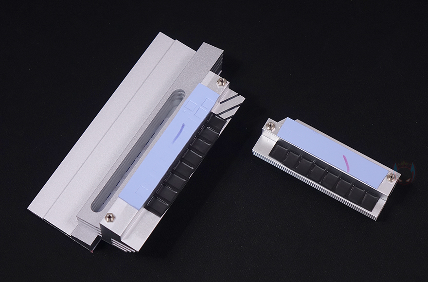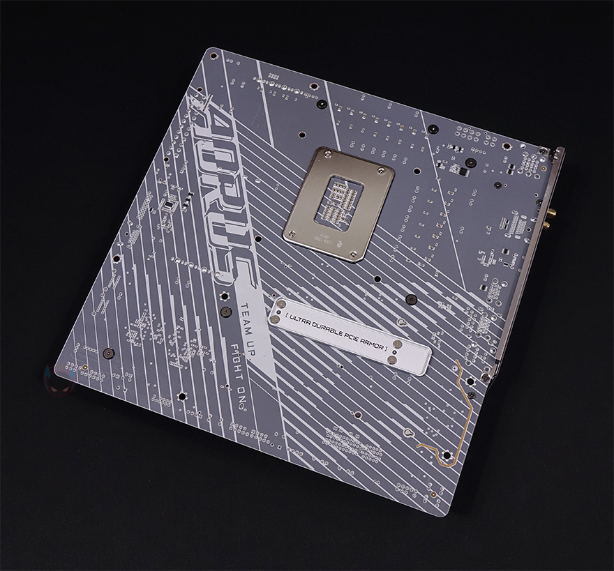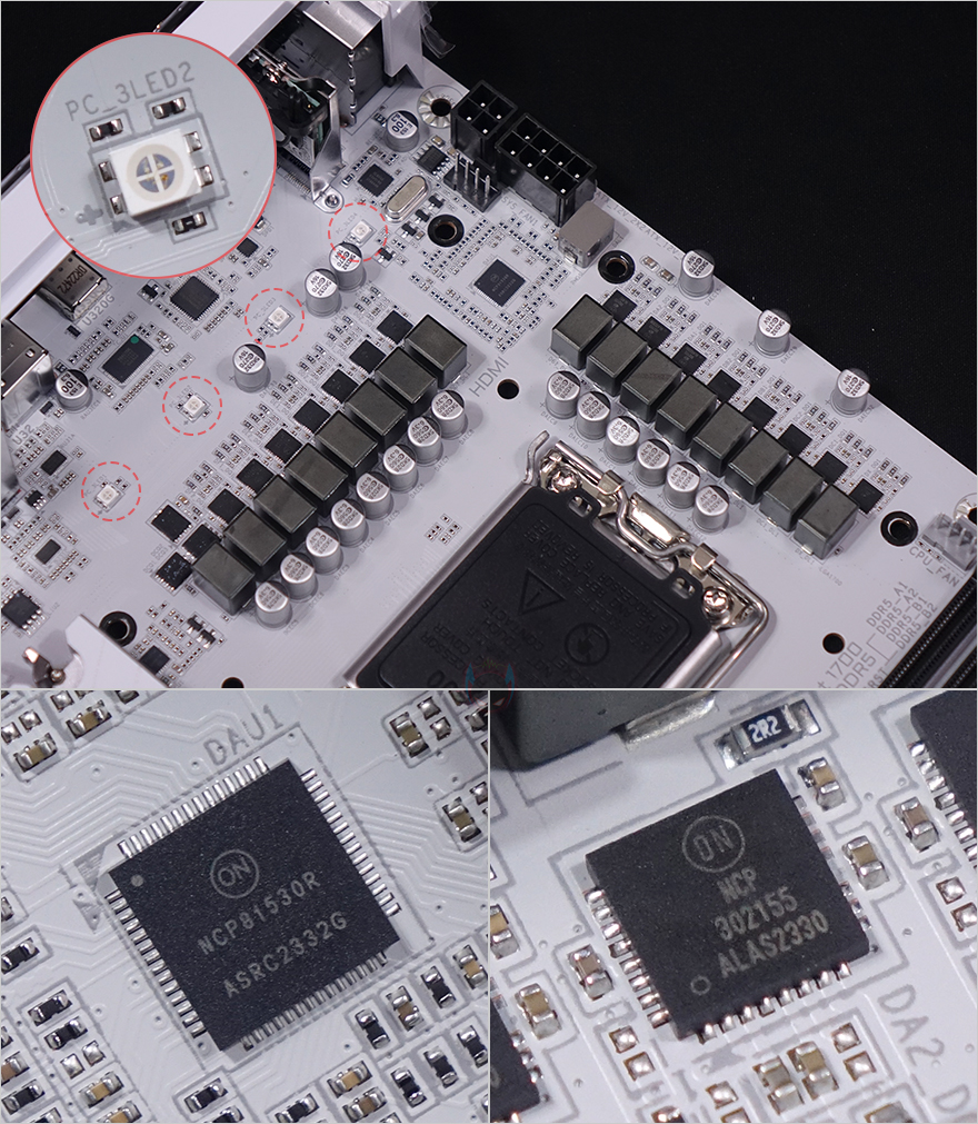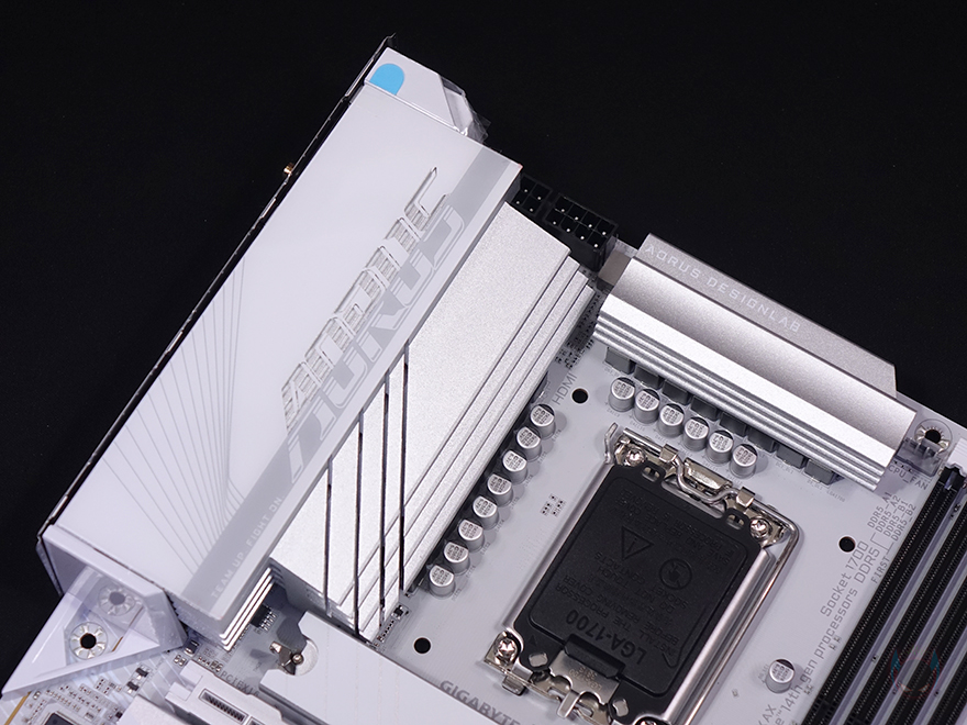 좀 더 자세히 살펴보면, B760M AORUS ELITE X AX 메인보드는 인텔 B760칩셋 기반이기 때문에 소켓은 13세대에 이어 14세대에서도 그대로 사용되는 LGA 1700 규격이며, 소켓 주변 전원부 발열을 해결하기 위한 히트싱크 역시 화이트 콘셉트에 맞춰서 실버색상으로 적용하고 있습니다. 특히, 백패널 방향에 장착된 큼지막한 히트싱크에는 상단에 어로스 로고와 함께 플레이트판이 적용되어 있습니다. 그리고, 히트싱크를 분리해서 안쪽을 보면 모스펫과 초크 발열해결을 위한 써멀패드를 기본 부착하고 있으며, 로고가 새겨진 부분의 안쪽은 홀-처리가 되어있는데, 바로 RGB 조명효과를 볼 수 있게 디자인처리한 거죠. 실제로 전원부 쪽을 보면 4개의 SMD LED가 적용되어 있는 것을 확인할 수 있습니다. 또한, 이는 먼저 나왔던 기본 B760M AORUS ELITE AX 메인보드에선 없었던 부분입니다. 전원부는 총 14+1+1 페이즈 구성으로 모스펫은 Dr.MOS로 디지털 전원부 구성이며, 전원부 컨트롤칩셋과 모스펫 모두 Onsemi사 칩셋을 사용했으며, 모스펫 개당 최대 전력공급은 60A입니다. 또한, 기본 모델이었던 B760M AORUS ELITE AX보다 2-페이즈(120A) 더 강화되었죠. 그리고, ATX 보조전원은 8+4핀 구조입니다.