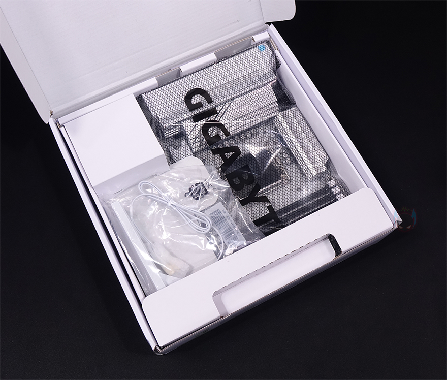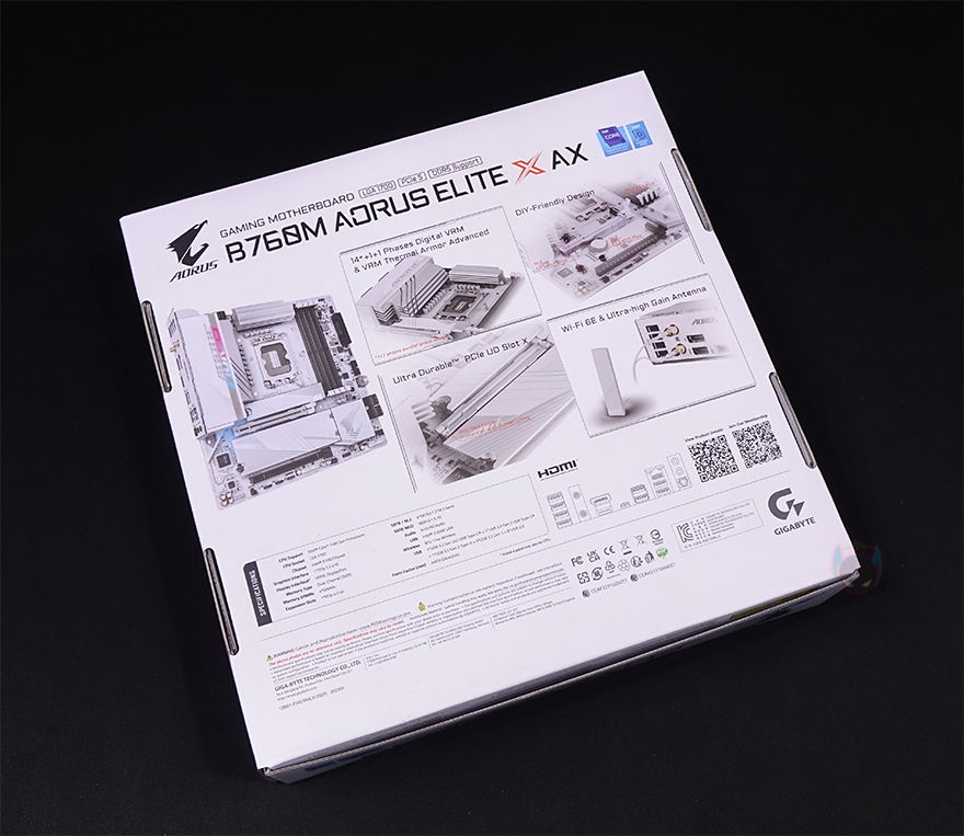 박스 후면에는 B760M AORUS ELITE X AX 메인보드 풀-샷 이미지와 함께 오른쪽에 제품 주요 특징을 이미지와 함께 쉽게 이해하도록 담고 있으며, 전원부, 편의성 디자인, 내구성 강한 PCIe 슬롯, 무선 Wi-Fi 6E 지원을 특징으로 담고 있습니다. 그리고, 아래에는 제품의 기본 사양 표기와 백패널 포트 이미지도 담고 있으며, 기가바이트가 최근 친환경 정책을 고려해 제품설명서 제공을 온라인으로 볼 수 있게 QR코드도 담고 있죠. 박스를 열어보면, 메인보드와 기본 구성품들은 비닐 포장으로 처리되어 있으며, 제품 구성은 B760M AORUS ELITE X AX 메인보드, 설치가이드, SATA 케이블 2개, Wi-Fi 6E 안테나 구성으로 간단합니다.