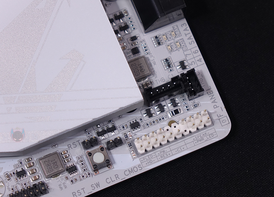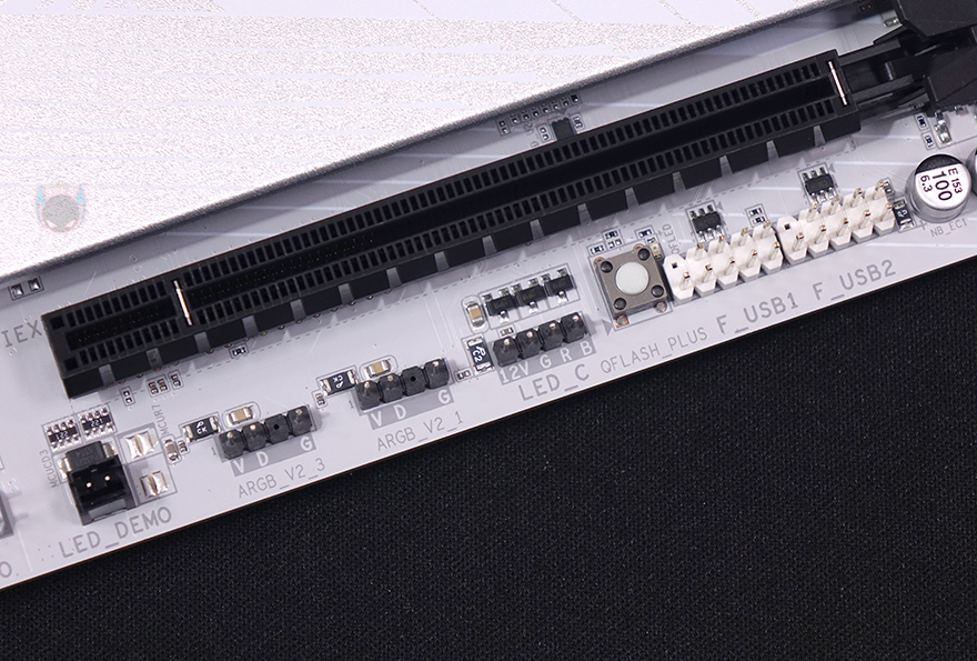 M.2 SSD 2번 슬롯 바로 오른쪽에는 B760 메인칩셋이 배치된 자리로 역시 칩셋 발열해결을 위해 히트싱크가 장착되어 있으며, 바로 오른쪽 측면에는 S-ATA 6Gbps 커넥터 4개가 배치되어 있고, 바로 옆에 부팅 작동상태를 확인할 수 있는 온보드 LED가 적용되어 있습니다. 그리고, 그 주변으로는 썬더볼트 카드와 연결되는 헤더, 리셋 버튼, PC케이스와 연결되는 전면 패널이 배치되어 있죠. 또한, PCIe 슬롯 2번 아래로는 USB 2.0/1.1 내부헤더, 5V ARGB 헤더 2개, 12V RGB 헤더, 바이오스 업데이트 시 사용되는 Q-Flash 버튼이 배치되어 있습니다.