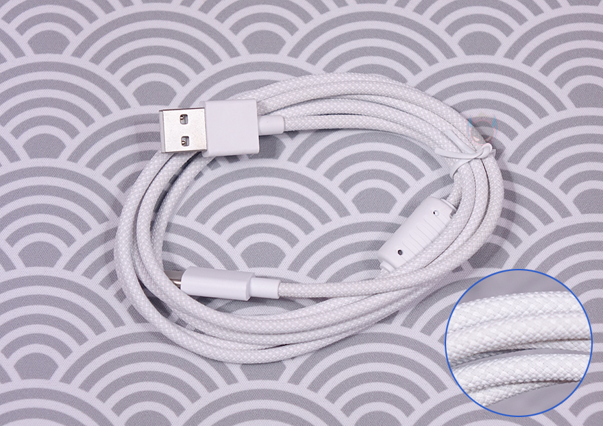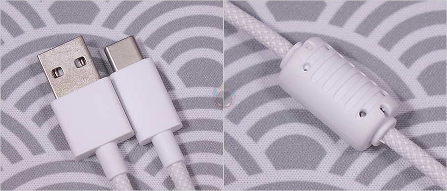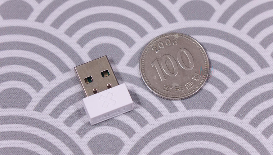 키보드 측면에서 보면, 타이핑에 최적화라 불리는 스텝-스컬처 2(step sculpture II) 단계배열을 갖추고 있으며, 바로 뒤에서 확인하겠지만, 밑바닥에 높낮이 조절 받침대가 있어서 기본 높이를 포함해 총 3단계로 높이조절을 할 수 있습니다. 키보드 밑바닥부분에는 모서리 부근마다 미끄럼 방지 및 진동소음 최소화를 위해 패드를 부착해 놨으며, 방금 언급했던 높낮이 받침대로 2단으로 적용된 것을 확인할 수 있죠. 그리고, 가운데 중앙 아래에는 무선 On/Off 스위치가 배치되어 있으며, 같은 위치 그대로 맨 위에 라벨 스티커를 통해 다시 한번 T80 키보드의 내장 배터리용량 표기를 확인할 수 있습니다. 끝으로, 기본 제공되는 USB 충전 및 전원케이블은 총 1.5m 길이에 꼬임방지를 위한 직조케이블이며, USB Type-A to C 인터페이스를 가졌고, 신호손실 최소화를 위해 노이즈필터도 적용되어 있습니다. 그리고, 무선 2.4G 사용 시 이용되는 동글이 수신기는 흔히 말하는 나노 수신기로 동전크기정도입니다.