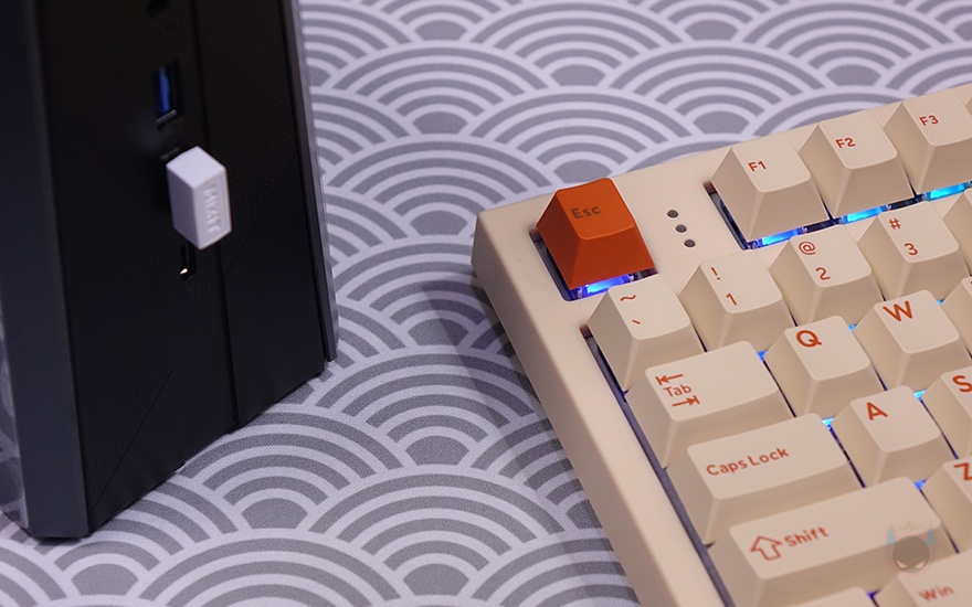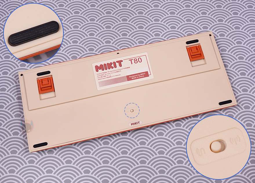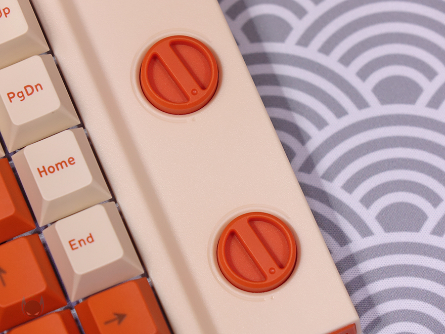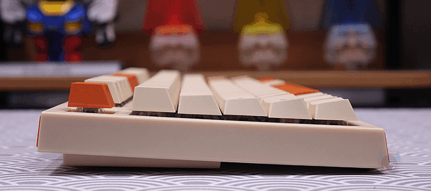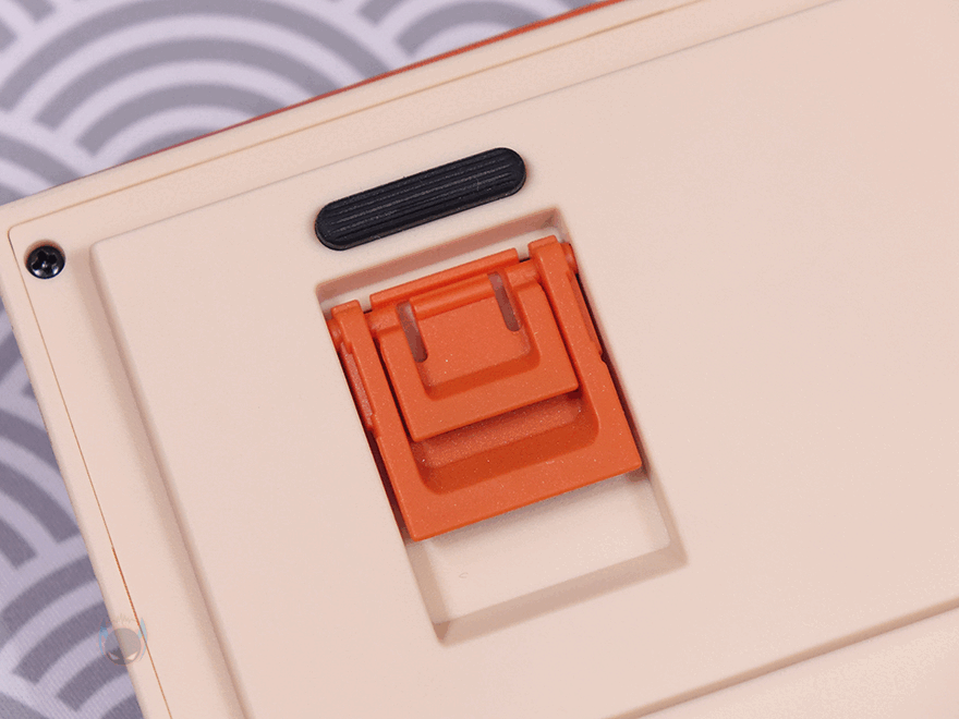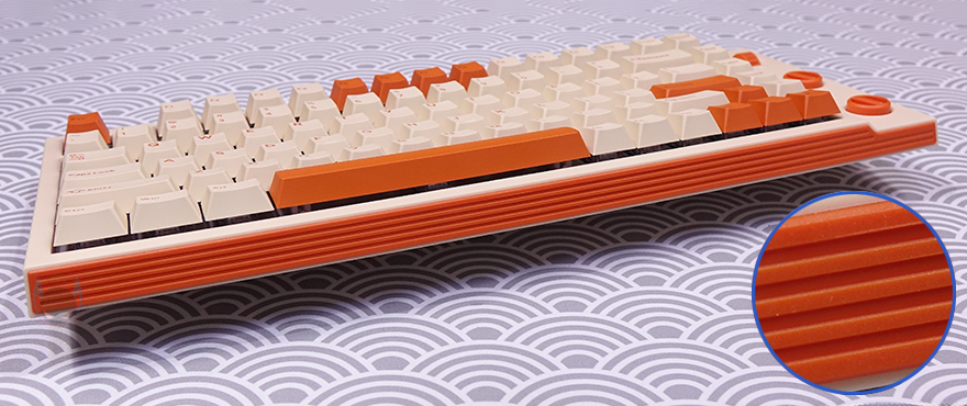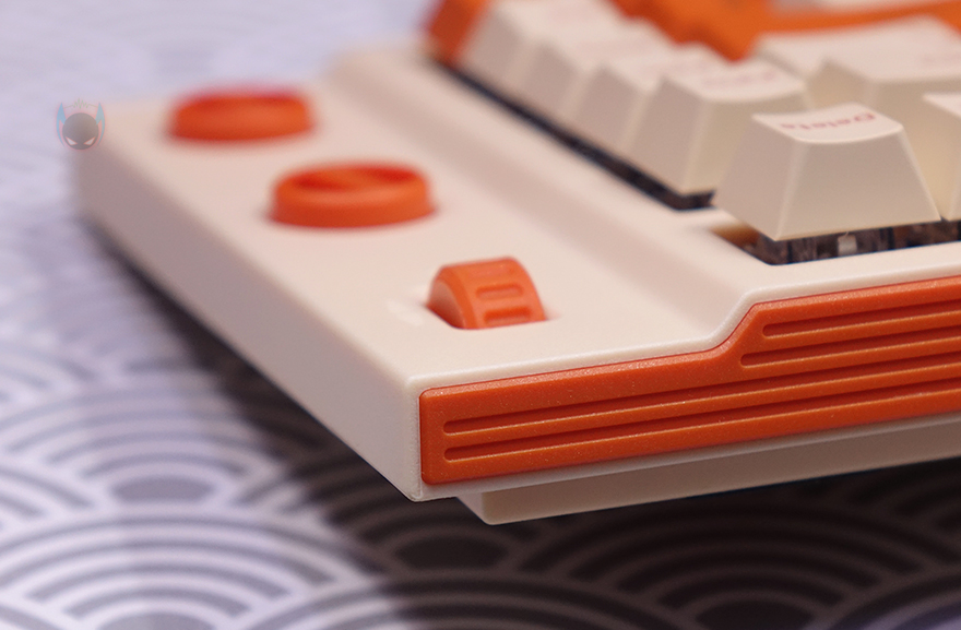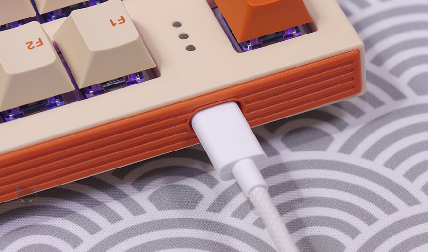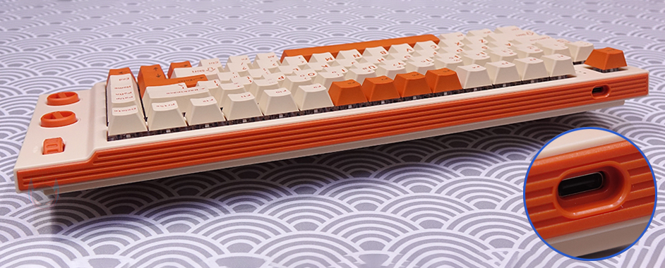 방금 언급했듯이 T80 키보드의 콘셉트는 레트로(Retro)입니다. 전형적인 오렌지(Orange color) 색상과 모레 색상 같은 비치 컬러(Beach Color)는 대표적인 레트로 컬러조합이죠. 그리고, 여기에 키보드 위아래 측면에는 스트라이프(Stripes) 디자인까지 적용되어 있어서, 레트로 스트라이트(Retro Stripe) 디자인으로 감성을 잘 살렸습니다. 또한, 전면 한쪽에는 유선 사용 시 USB 충전 및 전원케이블과 연결되는 USB Type-C 포트가 배치되어 있으며, 방금 확인했던 노브 자리는 키 위치들보다 약간 낮은 높이를 가지고 있는데, 이런 부분 역시 레트로 느낌을 살리는 디자인 부분 중 하나라 할 수 있습니다.