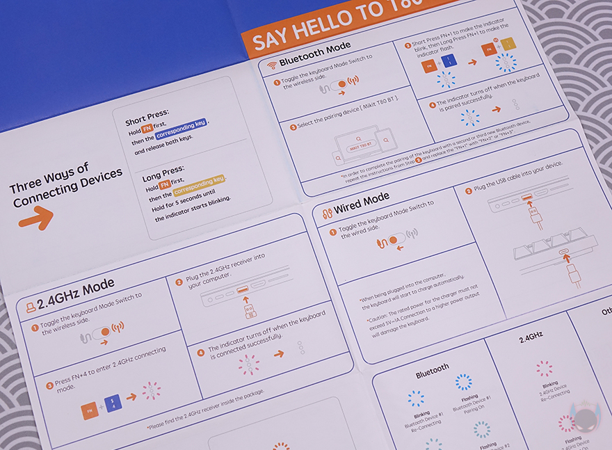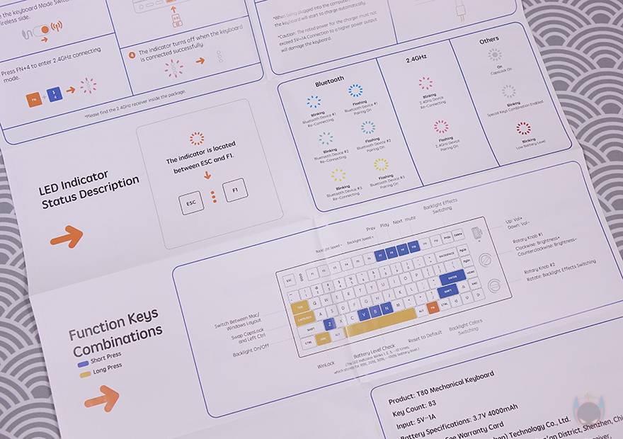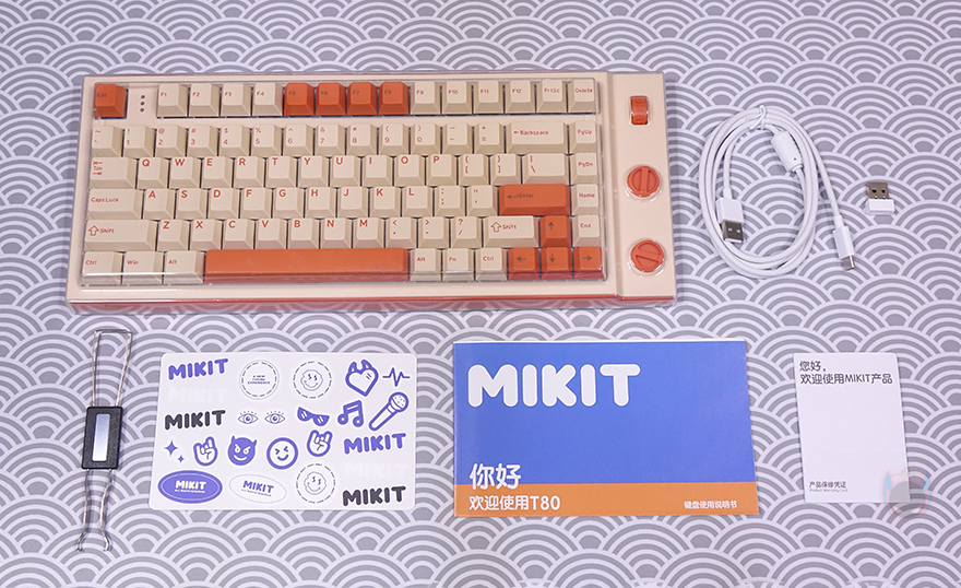기본 제공되는 덮개(Roof)는 다른 키보드 제품에서도 흔히 볼 수 잇는 얇은 두께의 투명 덮개로 T80 크기에 맞춘 형태라 아크릴 덮개 대신 그대로 사용해도 무방합니다. 그리고, 제품 구성에는 T80 기계식 키보드, USB 충전 및 전원케이블, 무선 2.4G 이용 시 사용되는 동글이 수신기, 키캡&스위치 리무버, MIKIT 스티커 굿즈, 제품설명서, 보증서로 이루어져 있으며, 제품설명서는 컬러 인쇄처리로 영문과 중국어로만 표기되어 있습니다.