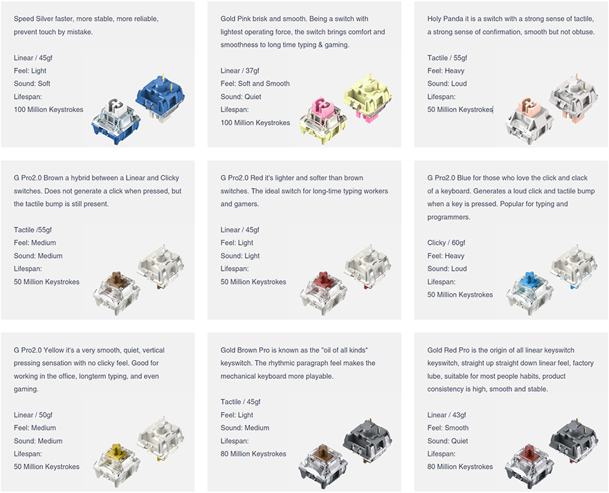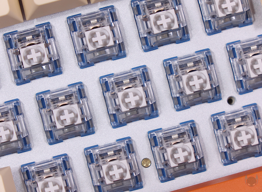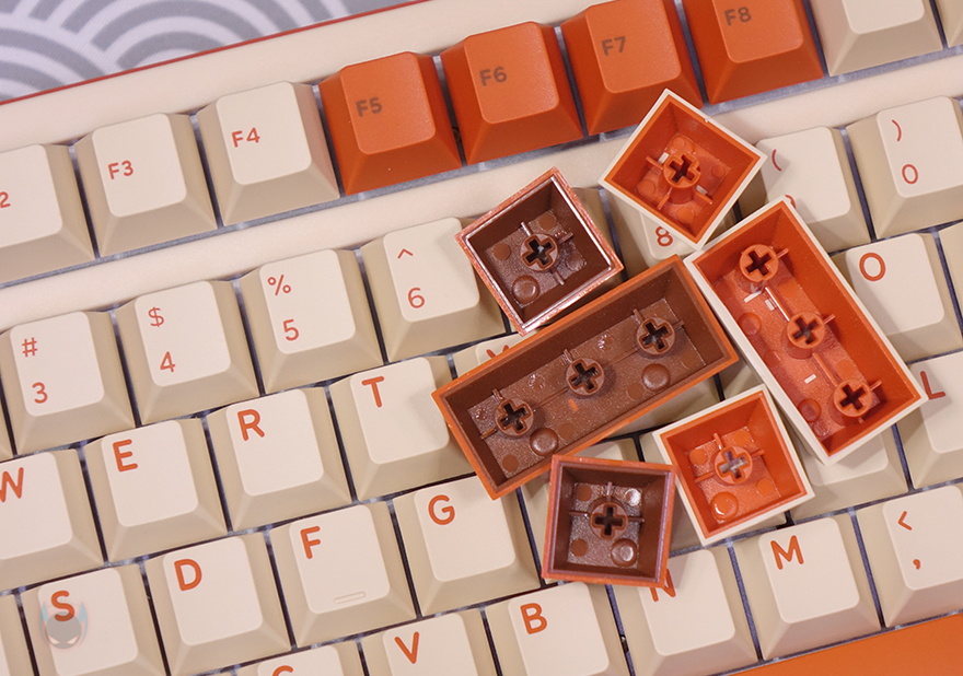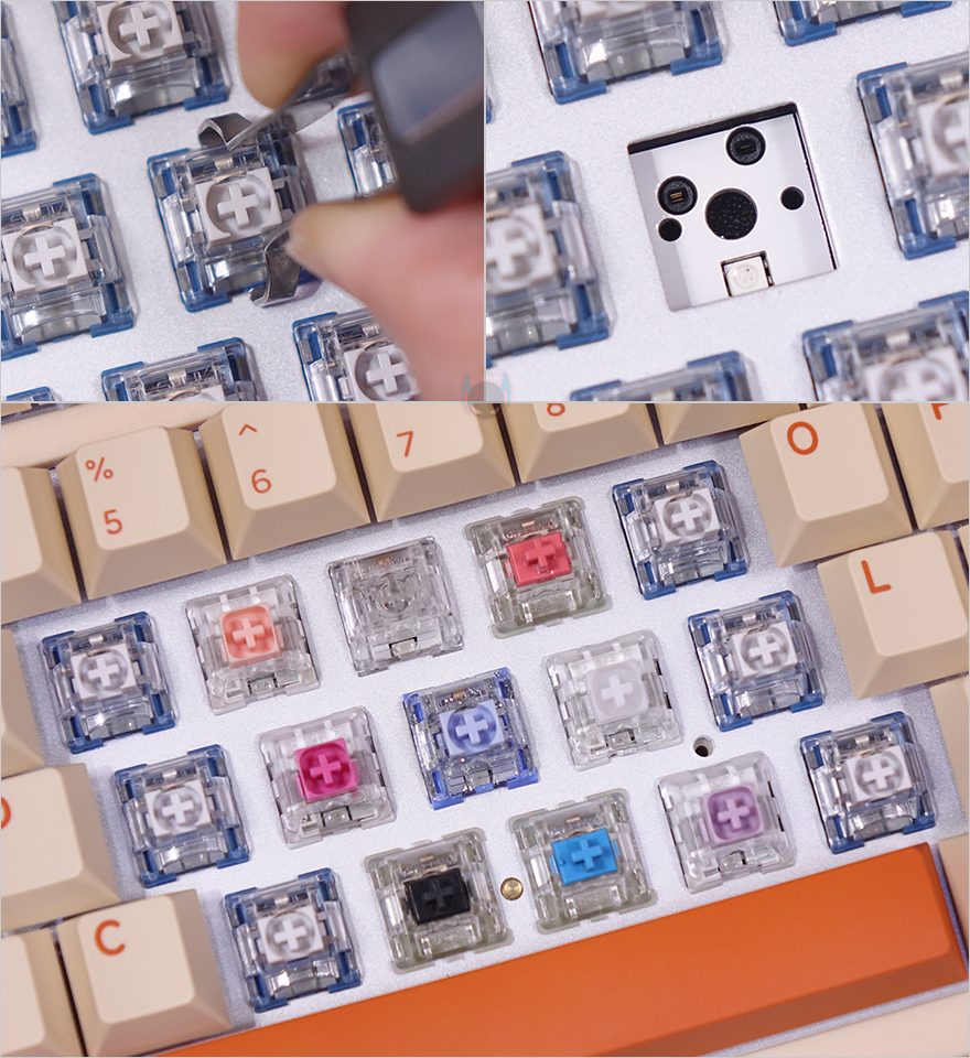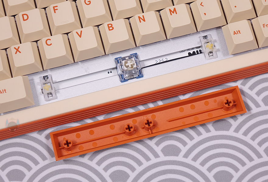 T80 키보드의 키캡은 PBT 재질에 100% 이중사출 방식으로 처리되었는데, 폰트 색상에 따라 안쪽에 오렌지 색상과 초콜릿(chocolate) 색상을 적용했죠. 그래서, T80 상품페이지를 참고하면 전체 모델명이 'T80 Hazel Choc RGB keyboard'라고 명시하고 있죠. 그리고, 스위치는 총 9가지 스위치 중 소비자가 선택할 수 있는데, 크게 게이트론(Gateron) G Pro 스위치와 TTC 스위치로 나뉩니다. 참고로 출시초기에는 홀리 판다 스위치도 있었지만, 현재는 제외된 상태입니다. 또한, 스위치는 핫-스왑(Hot-swap) 방식이라 제공되는 키캡&스위치 리무버로 스위치를 언제든지 분리/교체할 수 있으며, 5 Pin 구멍을 가지고 있어서 3 Pin과 5 Pin 모두 호환이 되며, LED 방향은 남향(South facing)으로 흔히 말하는 정방향입니다. 스페이스-바 같은 긴 키들의 스테빌라이저는 체리식입니다.