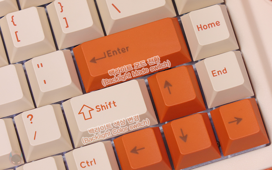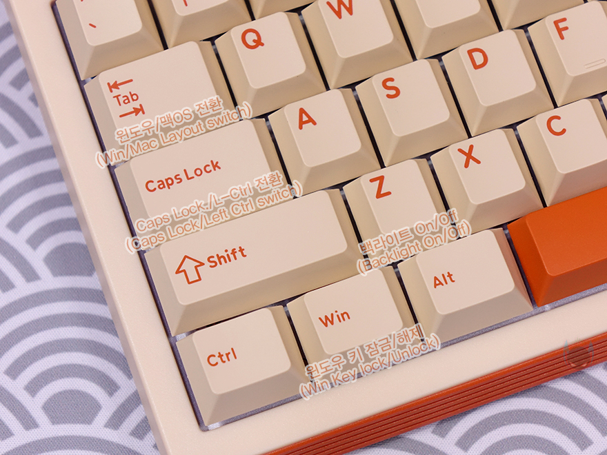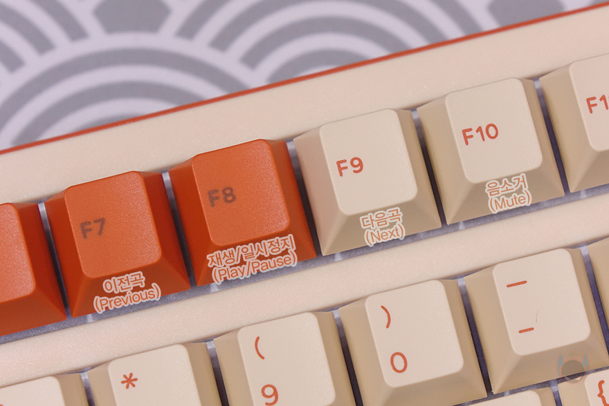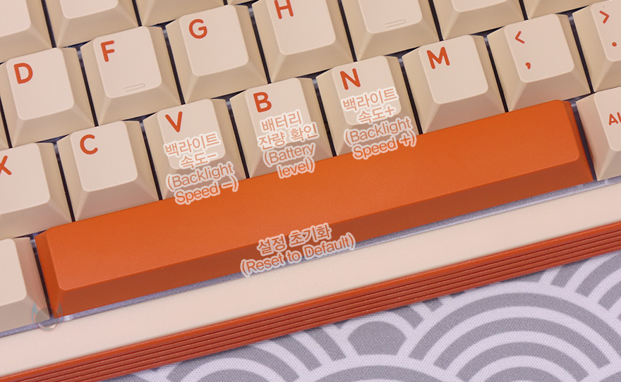 또한, T80 키보드 역시 Fn키 조합으로 부가 기능들을 지원해주고 있는데, 다만 앞서 확인했듯이 오른쪽에 볼륨조절과 백라이트 모드 전환과 밝기조절 노브가 있어서 Fn 키 조합 가지수는 적은 편입니다. 일단, Fn+F7~F9까지는 미디어 재생컨트롤러이며, F10키는 음소거(Mute), 그리고, 노브로 백라이트 모드전환 기능이 있지만, Fn+Enter 조합으로 동일한 기능을 갖추고 있으며, 바로 아래 Fn+오른쪽 Shift 조합으로는 색상변경을 할 수 있죠. 이밖에 Fn+Tab 조합으로는 윈도우와 맥OS 자판 레이아웃 전환을 할 수 있으며, Fn+Caps lock 조합으로는 왼쪽 Crtl키와 서로 기능을 변경할 수 있고, Fn+Z 조합으로는 백라이트 On/Off, Fn+윈도우(Win)키 조합으로는 윈도우키 잠금/해제, Fn+V/B/N 조합으로는 배터리 잔량 확인, Fn+스페이스-바 조합은 초기화설정을 가지고 있습니다.