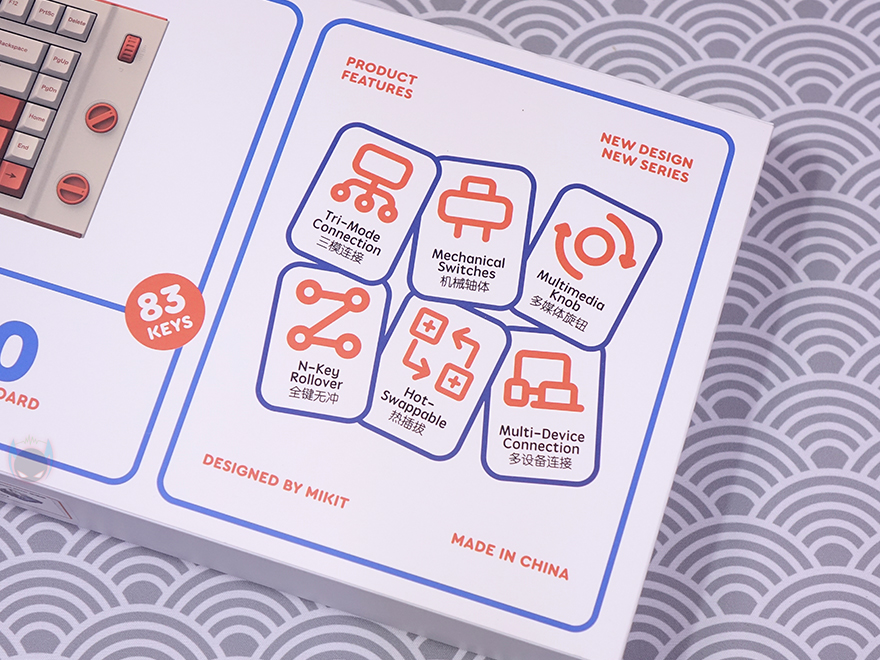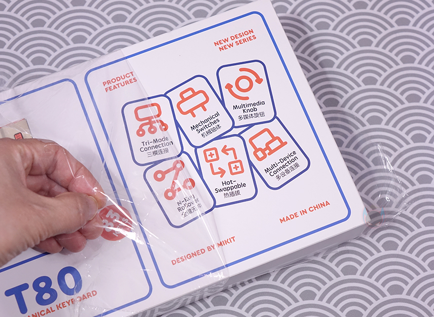 이제 본격적으로 MIKIT T80 키보드의 제품 박스를 살펴보면, 앞서 만난 제품들처럼 제품박스는 전체 비닐포장이 한 번 처리되어 있으며, 박스 전면 왼쪽에는 제품 이미지를 담고 있으며, 모델명과 함께 키 수(Keys)와 레이아웃(Layout) 표기를 확인할 수 있습니다. 뒤에서 다시 확인하겠지만, T80은 83키에 80% 배열 키보드입니다. 그리고, 바로 오른쪽에는 제품의 주요 특징을 6가지 표기해 놨는데, 3가지 연결방식, 스위치, 노브(Knob), 동시 입력(N-key rollover), 핫스왑(Hot-swap), 다중 연결(Multi-Device)을 언급하고 있죠. 그리고, 역시 제품박스에서도 측면에서 스위치 구분 표시를 확인할 수 있습니다.