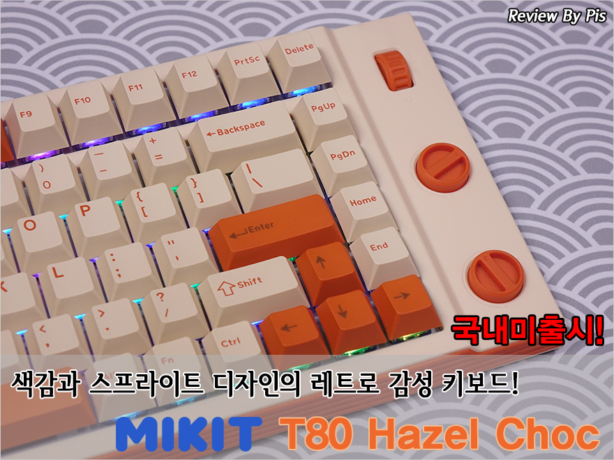 이미 피스커뮤를 통해 여러 번 소개된 MIKIT는 시작에서도 언급했듯이 디자인부분에서 경쟁사들과 확실한 차별성을 보여주는 브랜드입니다. 오늘 만난 83 키 80% 배열의 T80 역시 한눈에 봐도 레트로(Retro) 콘셉트라는 걸 쉽게 알 수 있게 레트로 스트라이프와 색상을 적용해 감성을 제대로 살리고 있으며, 텐키리스보다 작은 배열임에도 방향키와 특수키를 유지하면서 동시에 독립 실행으로 편리하게 사용할 수 있는 노브(Knob)까지 적용했습니다. 실제로 사용해 보면, 따로 Fn키 조합 없이 바로 볼륨조절과 백라이트 기능이 편리하다는 걸 느낄 수 있습니다. 여기에 이중 흡음재와 정방향의 남향 LED, 그리고 핫스왑 스위치, PBT 키캡, 유선/무선 2.4G/블루투스 3가지 연결방식까지 요즘 트렌드도 빠짐없이 다 담았습니다. 스위치 역시 총 8가지 중 소비자가 선택할 수 있게 폭넓게 갖추고 있죠. 텐키리스보다 적은 배열을 선호하면서 확실한 차별성의 디자인 그리고 기왕이면 레트로 감성까지 선호하는 소비자라면 MIKIT T80 기계식 키보드를 추천합니다.