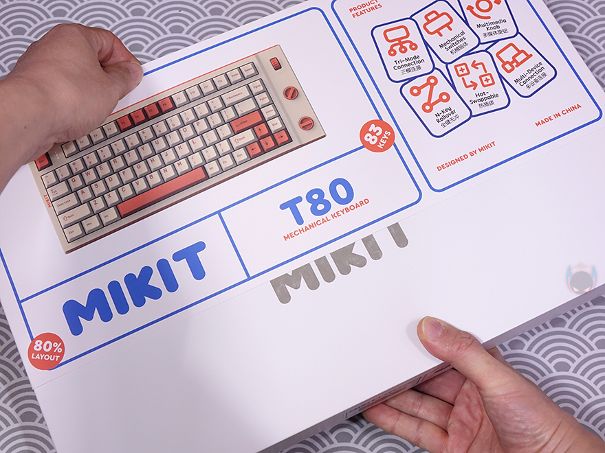 이미 앞서 MIKIT의 CL80 키보드와 DK65 키보드를 만나보면, 확인했지만, MIKIT는 제품 패키지에서부터 차별성을 가지고 있죠. 일반적인 키보드 제품들을 구입해 보면, 제품박스에 외부 완충재를 포장해 배송을 해주는데, MIKIT는 제품박스에 외부에 별도의 포장박스를 한 번 더 적용합니다. 그것도 단순한 포장박스가 아닌 MIKIT 로고까지 새긴 박스죠. 포장박스에는 새 제품 표시와 측면에 제품 모델과 스위치 구분 표시를 확인할 수 있으며, 포장 박스를 뜯는 부분도 절취선으로 처리되어 깔끔하게 뜯을 수 있습니다. 그리고, 포장 박스를 열어보면, 안에 완충재와 함께 T80 제품박스를 확인할 수 있죠.