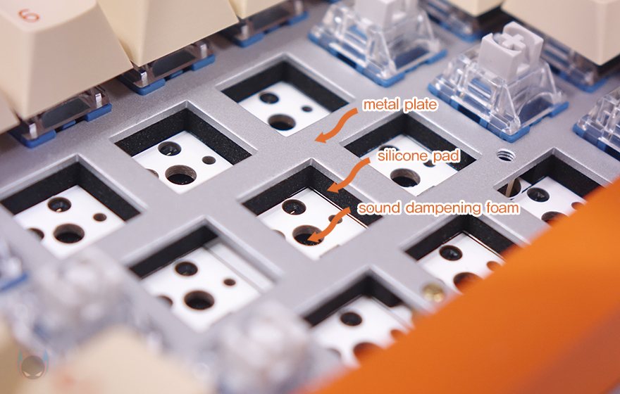 그리고, T80 키보드 역시 요즘 기계식 키보드의 트렌드인 이중 흡음재를 적용하고 있는데, 따로 분리는 하지 않아도, 스위치만 분리한 상태에서 측면에서 보면 메탈재질의 보강판 아래에 1차 흡음재로 실리콘 패드(Silicon Pad)가 들어간 것을 확인할 수 있으며, PCB기판 바로 아래에도 스펀지 같은 폼재질로 2차 흡음재가 적용된 것을 확인할 수 있습니다.