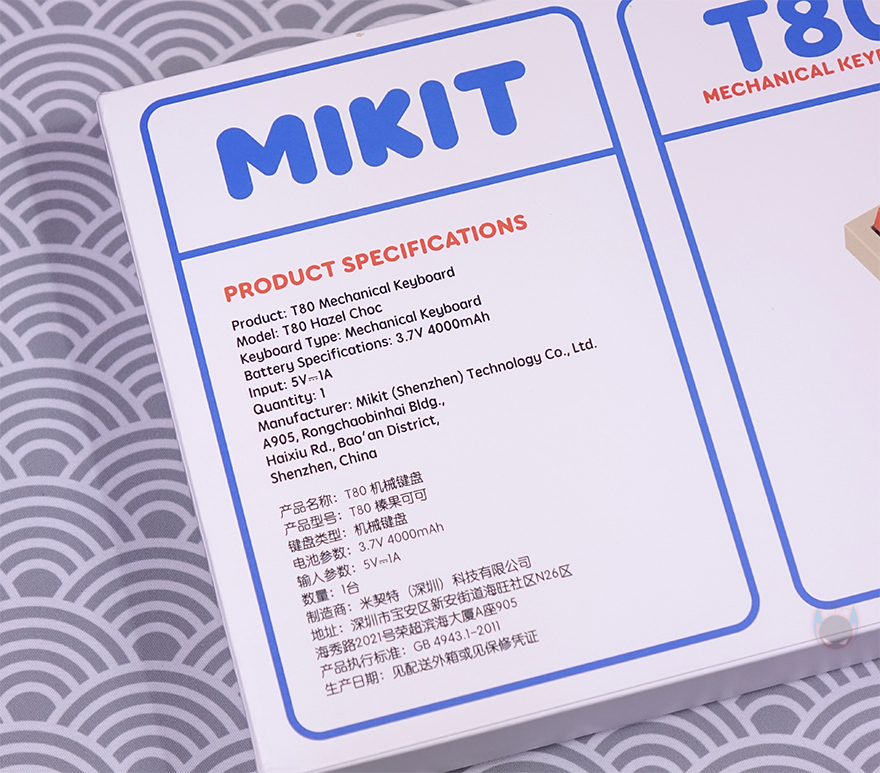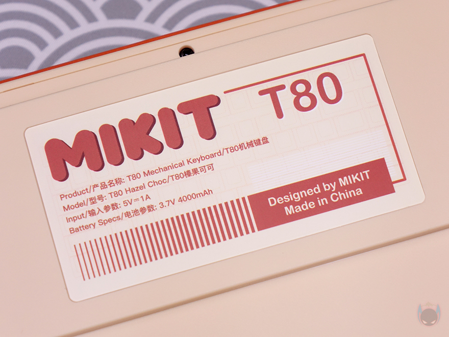 박스 후면에는 전면과 마찬가지로 제품 이미지를 다시 확인할 수 있으며, 왼쪽에 제품의 기본 사양을 표기해놨습니다. 배터리 용량과 전압 표기를 확인할 수 있죠. 방금 제품 박스에서 확인한 부분들은 겉표지에 담고 있는 것들이며, 겉표지를 벗기면 심플하게 MIKIT 로고를 새긴 속박스를 확인할 수 있는데, 박스를 열어보면, T80 키보드 크기에 맞춘 기본 덮개(Roof)와 비닐포장된 T80 그리고, 그 아래에 나머지 구성품이 담긴 액세서리 박스를 확인할 수 있습니다.