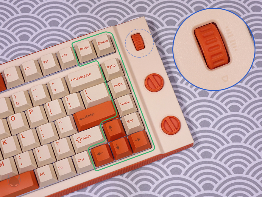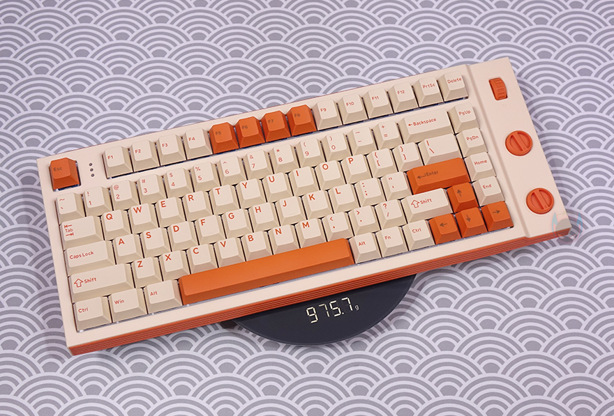 그럼, 이제 MIKIT T80 키보드의 디자인과 레이아웃을 살펴보는데, 디자인은 한눈에 봐도 색상에서부터 레트로(Retro) 감성을 느낄 수 있습니다. 그리고, 앞서 언급했듯이 총 83키의 80% 배열을 갖추고 있으며, 무게는 약 975g으로 텐키리스보다 작은 크기임에도 무게감이 있죠. 또한, 텐키리스보다 크기를 줄이면서도 방향키와 일부 특수키를 담고 있으며, 맨 오른쪽에 3개의 노브(Knob)가 적용된 것을 확인할 수 있는데, 마우스 휠-버튼처럼 생긴 휠(Wheel)은 볼륨조절(Volume control) 기능이며, 아래 2개의 수평 회전 노브는 위에는 RGB 백라이트 밝기조절(Brightness control), 아래에는 RGB 백라이트 모드전환(Mode switch) 기능을 가졌습니다.