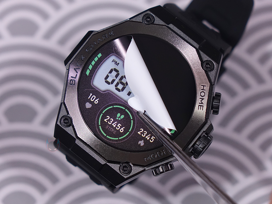 디스플레이는 앞서 주요 특징에서 확인했듯이 1.43인치 크기의 아몰레드(AMOLED)이며, 좀 더 자세히는 1670만 색상에 466x466 해상도를 갖추면서 60Hz 주사율과 600 니트(nit) 밝기와 326PPI 픽셀밀도를 갖추고 있습니다. 참고로 이와 동일한 화면 사양을 가진게 샤오미 S1 모델이죠. 그리고, 디스플레이 테두리 베젤부분에는 왼쪽에 Black Shark 로고(Logo)를 새겨놨으며, 오른쪽에는 측면 버튼과 다이얼 위치와 함께 HOME과 MODE 표시를 해놨는데, HOME 위치의 측면 버튼은 업(UP), MODE 위치의 측면 버튼은 다운(Down) 기능도 함께 갖추고 있습니다. 그리고, 가운데 버튼은 다이얼 버튼으로 메뉴들을 다룰 때 사용하죠.