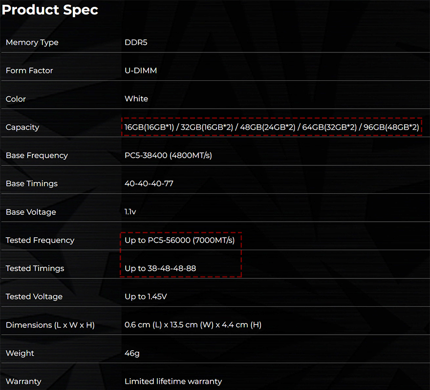 방열판 높이는 약 36mm로 대부분의 타워형 CPU 쿨러를 사용했을 시 간섭이 생기지 않도록 했으며, 상단 RGB 라이트효과를 직관적으로 볼 수 있는 LED 바에도 VIPER 문구를 한쪽에 새겨놨죠. 그리고, 방열판 한쪽에는 해당 제품의 용량과 클럭, 전압표기를 해놨는데, 현재 VIPER Elite 5 RGB DDR5 메모리에서 가장 높은 클럭을 가진 모델은 7000 MHz이며, 1.45V 전압으로 XMP 프로파일을 가지고 있습니다. 반대로 가장 낮은 클럭은 4800 MHz에 전압 1.1V 모델이며, 용량은 최대 96GB 모델까지 있는데, 48GBx2 듀얼키트로 논-바이너리(non-binary) 메모리입니다.