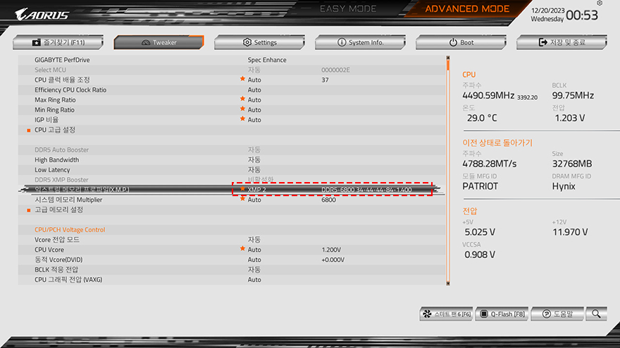 직접, 패트리어트 VIPER Elite 5 RGB DDR5 메모리를 사용해보는데, 리뷰에선 앞서 언급한 가장 높은 클럭인 7000 MHz 사양의 XMP 프로파일이 적용된 모델로 사실상 현재 Elite 5 RGB DDR5에서 최상급 모델입니다. 실제로 메인보드 CMOS에서 XMP 프로파일값을 확인해 보면, 3개의 프로파일 중 1개가 가장 높은 7000 MHz 클럭을 가진 것을 확인할 수 있죠. 쉽게 말해, XMP 프로파일 한 번으로 7000 MHz까지 오버클럭이 되는 겁니다. 물론, 이보다 클럭의 XMP 프로파일도 2개 있는데, 이렇게 3개의 XMP 프로파일을 제공하는 이유는 DDR5의 기본 클럭은 4800 MHz과 5600 MHz입니다. 이보다 높은 클럭은 모두 오버클럭이라고 부르는데, 6400 MHz이상부 터는 메모리, 메인보드, CPU 이 3가지 조합이 중요해집니다. 일단, 메모리는 시작에서 언급했듯이 SK 하이닉스 A다이/M다이 모듈과 PMIC칩이 적용되면, 메인보드 PCB층이 8-레이어로 만들어졌을 경우 6800~7000 MHz까지 쉽게 오버클럭이 됩니다. 메모리와 메인보드 이 2가지 조건에서 추가로 CPU 등급에 따른 메모리컨트롤러 수율까지 좋으면 DDR5 기본 최대전압인 1.435V 안에서 7600 MHz까지 갈 수 있고, PMIC칩이 언락이면 그 이상 전압으로 더 높은 오버클럭까지 가능하죠. 일단, Elite 5 RGB DDR5는 XMP 프로파일에서 확인했듯이, 7000 MHz 설정값에 전압에 1.45V로 PMIC칩이 전압해제인 언락이라는 걸 알 수 있으며, 메모리 모듈도 하이닉스 A다이 혹은 M다이 모듈이라는걸로 쉽게 추측할 수 있습니다. 단, 1.45V 전압은 7000 MHz 클럭대비 기본적으로 전압을 높게 잡은 설정된 값이라 방금 언급한 메인보드 PCB 레이어만 받쳐줘도 1.45V이하 설정으로도 7000Hz 클럭이 적용됩니다. 실제로 필자의 경우 소비자입장을 고려해 가격부담을 줄일 수 있는 최소한의 조건에서 실행했으며, 12세대 i5 CPU와 B760 메인보드(8-레이어 PCB) 조합에서 쉽게 7000 MHz 값 XMP 프로파일이 적용된 것을 확인할 수 있습니다. 물론, 이런 조건이 되지 않을 때는 이보다 낮은 6800 MHz이나 6600 MHz 클럭으로 설정해야 작동될 수도 있기 때문에, 방금 확인한 나머지 2개의 낮은 클럭값 XMP 프로파일이 추가로 들어있는 겁니다.