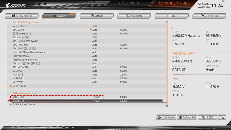 그리고, 앞서 XMP 프로파일에서도 확인했듯이 7000 MHz XMP값의 전압 같은 경우 1.45V로 클럭대비 높게 설정되어 있습니다. 하이닉스 A다이(혹은 M다이) 모듈과 PMIC칩 언락이 적용되었다라는 걸 쉽게 확인시켜주기 위해서 설정값을 이렇게 저장했다 판단할 수 있는데, 방금 확인했듯 이 2가지 조건에 메인보드 PCB 레이어층만 뒷받침되어도 DDR5 기본 최대 전압인 1.435V 이하에서 7400~7600MHz까지도 적용시킬 수 있습니다. 실제로, 램 타이밍값을 그대로 유지하고, 전압도 낮춘 상태에선 VIPER Elite 5 RGB DDR5를 7600MHz까지 추가로 오버클럭할 수 있었고, 성능도 더 올라간 것을 확인할 수 있었습니다. 물론, 방금 언급했듯이 PMIC칩 언락이 적용되었다라는걸 쉽게 확인시켜 주기 위해 1.45V 전압이 설정된 거이라 8층 PCB이상의 고가형 메인보드와 등급이 높은 고가형 CPU를 사용하고 있다면, 그리고, VIPER Elite 5 RGB DDR5 메모리의 7800~8000 MHz이상의 오버클럭도 가능하겠습니다.
