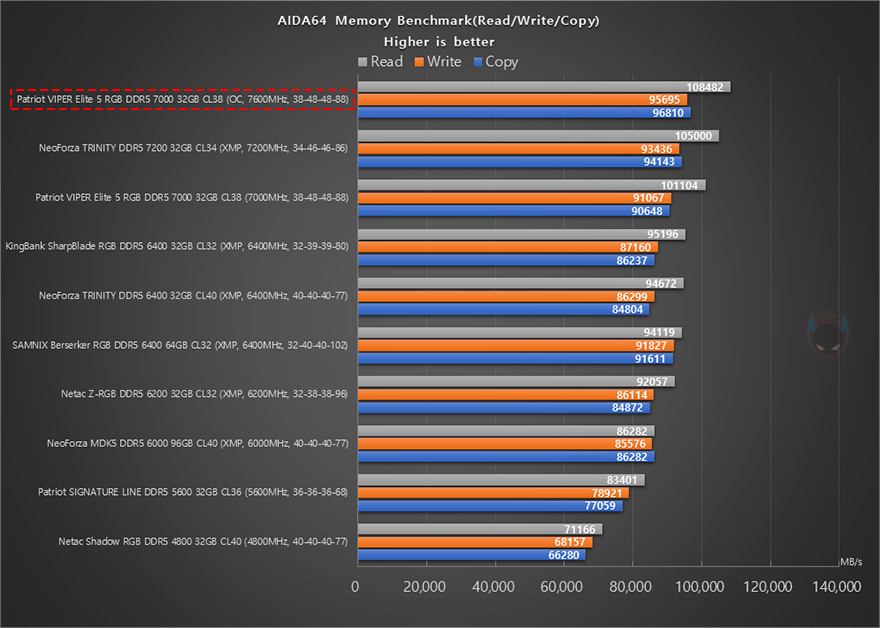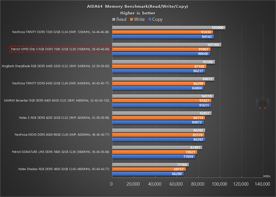 방금 확인했듯이, 리뷰에 사용된 VIPER Elite 5 RGB DDR5 최상급 모델인 7000 MHz에는 3개의 XMP 프로파일이 저장되어 있습니다. 6600MHz, 6800MHz, 7000MHz 이 중 당연히 성능이 가장 좋은 것은 7000MHz입니다. 그래서, 7000MHz XMP 프로파일 설정으로 VIPER Elite 5 RGB DDR5 메모리의 성능을 확인해 보면, 메모리 성능으로 가장 많이 이용되는 AIDA64의 Memory Benchmark를 통해서 전체 DDR5 비교 모델들 중에서도 상위급에 속하는 걸 확인할 수 있습니다.