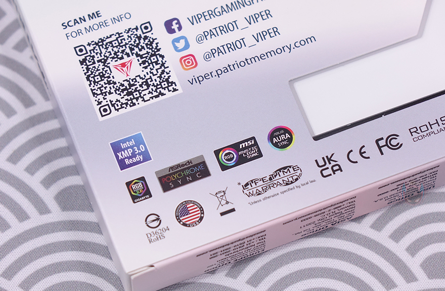 그럼, 이제 제품 패키지를 살펴보는데, 시작에서도 언급했듯이 Elite 5는 VIPER의 화이트 콘셉트로 나온 제품입니다. 그래서, 제품박스부터 화이트색상을 가지고 있죠. 그리고, 제품 이미지도 박스에 담겨져 있어서 미리 메모리 방열판 디자인이 확인되는데, 방열판 색상도 화이트입니다. 이밖에도 모델명을 비롯해 클럭과 용량 표기, RGB 라이트닝효과 지원을 확인할 수 있는데, 뒤에서 확인하겠지만 RGB 라이트닝효과는 패트리어트 자체 RGB 프로그램으로도 가능하고, 메인보드 RGB Sync와도 가능합니다.
