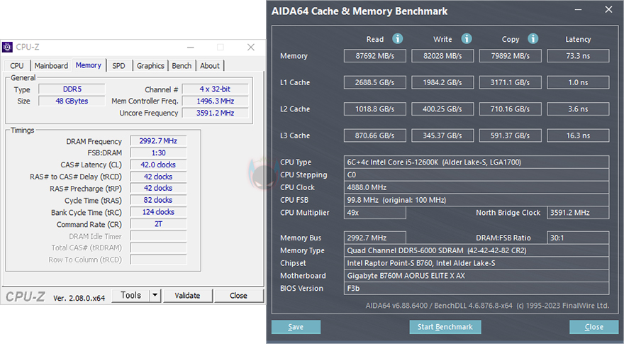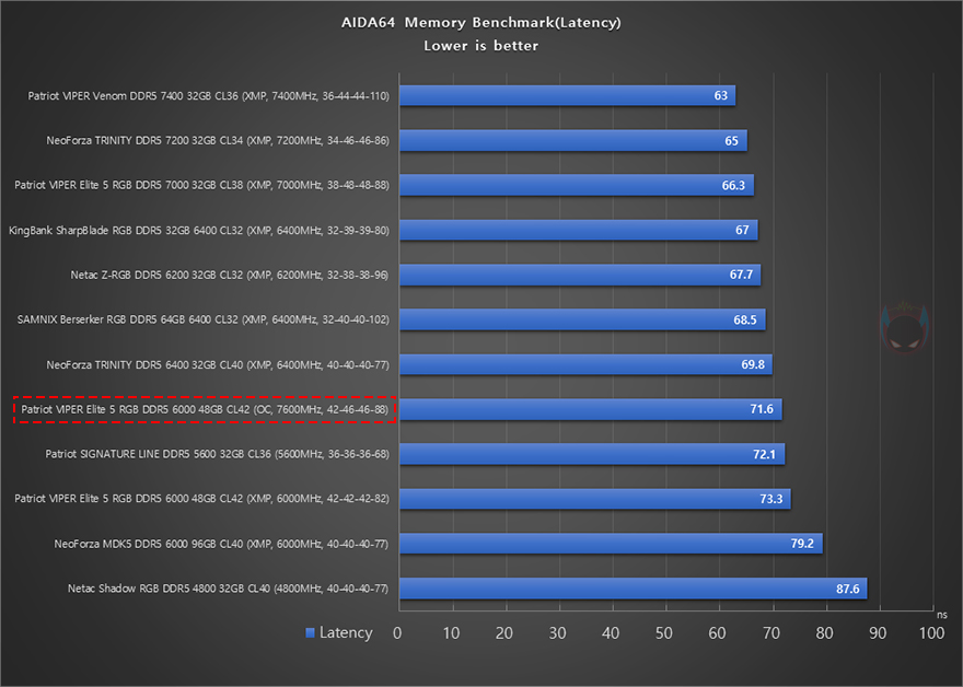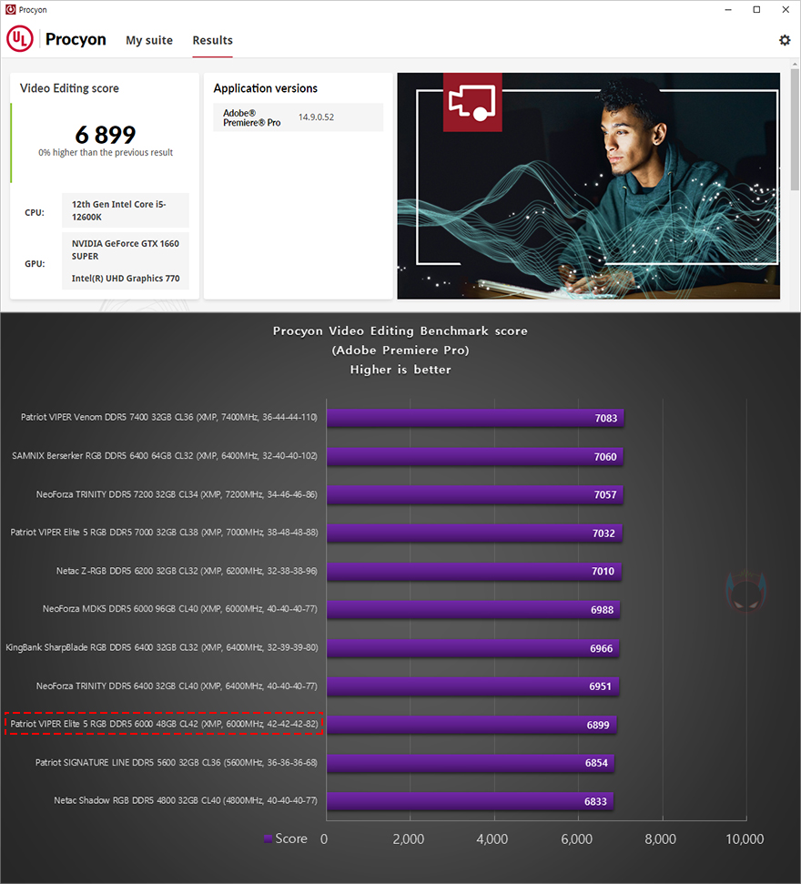 그리고, 시작에서도 언급했듯이 24GB, 48GB 용량은 논-바이너리 규칙이라 성능보다는 용량과 안정성에 중점을 두고 나온 메모리입니다. 그래서, VIPER Elite 5 RGB DDR5 48GB(24GBx2) 메모리를 XMP 프로파일 6000MHz으로 불러와 적용해 성능확인을 해보면, AIDA64 Memory Benchmark를 비롯해, NovaBench Memory Test, Passmark PerformanceTest Memory Mark까지 용량보다 클럭이나 램타이밍 위주로 성능을 보여주는 벤치마크 프로그램에서 동급 클럭의 메모리들과 비슷한 성능을 보이거나 이보다 낮은 클럭의 메모리보다 낮은 성능을 보여줍니다. 물론, 논-바이너리의 등장이 용량이기 때문에 실제 메모리 영향이 높은 Adobe 포토샵이나 프리미어 프로로 벤치마크할 수 있는 Procyon에선 동급 클럭 메모리들 보다 높은 성능을 보여주죠. 물론, 논-바이너리 특성상 용량이 클수록 성능은 낮아집니다. 쉽게 말해, 48GB(24GBx2)보다는 96GB(48GBx2) 메모리의 성능이 낮다라는 거죠.