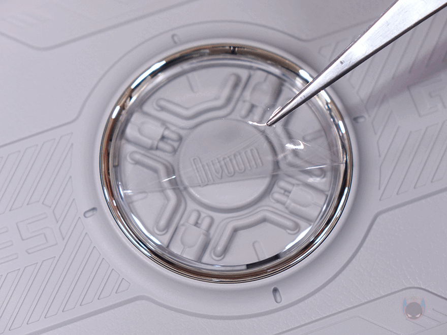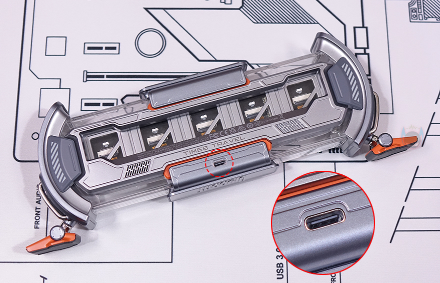 제품 상단(Top)에는 중앙 위치에 버튼들(Buttons)이 배치되어 있는데, 가운데 전원(Power) 버튼을 비롯해 양쪽으로 각각 라이트 전환(Light switch)과 모드 전환(Mode switch) 버튼이 배치되어 있으며, 앞부분에는 좌우(Left/Right) 버튼이 배치되어 있습니다. 라이트 전환 버튼은 뒤에서 확인하겠지만, 방금 언급했던 양쪽 게이트 부분에 라이트닝 모드를 변경하는 기능을 가지고 있으며, 모드 전환은 디스플레이(Display) 화면을 전환하는 기능을 가졌습니다. 그리고, 제품 후면에는 함께 제공되는 USB 전원케이블(Power cable)과 연결되는 USB Type-C 포트가 배치되어 있으며, 후면에서 디스플레이 내부도 일부 확인할 수 있죠.