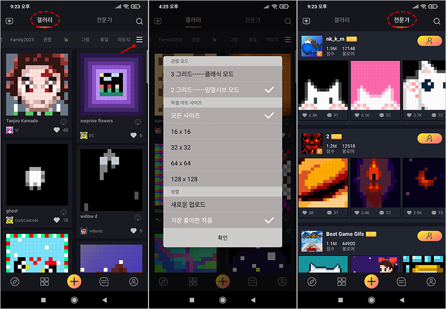 어플(App)까지 연동이 되면 이제 사용자가 자유롭게 5개의 LCD 화면을 원하는대로 지정해 놓을 수 있는데, 일단 어플을 통해서는 메인화면에 갤러리와 전문가 크게 2개의 카테고리로 분류해 이용자들이 직접 만든 픽셀 아트 작품 및 기능들을 한눈에 볼 수 있고, 선택해서 적용시킬 수 있습니다. 참고로, 갤러리 카테고리에선 검색설정을 추가로 할 수 있으며, 메인화면에서 아래에 있는 '+' 버튼을 누르면, 사용자가 직접 픽셀 아트를 만들 수 있는 애니메이션 프레임으로 들어갈 수 있습니다. 이 밖에도 아래에 나열된 버튼별로 들어가 보면, 맨 왼쪽에는 Times Gate를 기능적으로 사용할 수 있게 기능 모드를 적용할 수 있으며, 기기설정도 가능합니다. 그리고, 아래 버튼 왼쪽에서 2번째 버튼은 5개의 LCD 화면을 사용자가 쉽게 지정할 수 있게 해주는 기능으로 5개의 화면은 하나의 콘셉트로 전체 화면으로 보여주는 방식과 사용자가 직접 1개씩 지정할 수 있는 화면 방식, 그리고, 앞서 확인한 RGB 라이트닝 효과를 설정할 수 있습니다. 이 외에도 이용자들이 정보를 공유할 수 있는 커뮤니티 게시판 기능도 있으며, 사용자의 프로필정보 기능도 어플에 담고 있습니다.