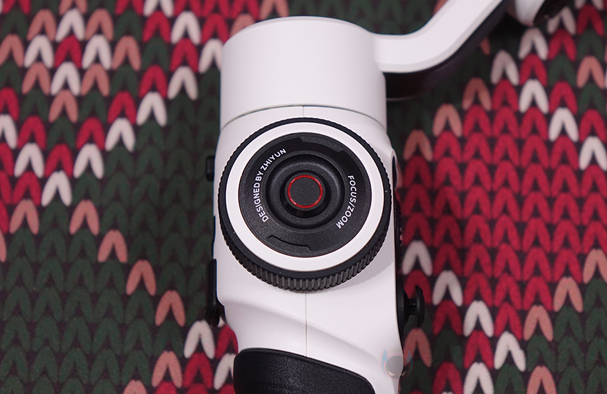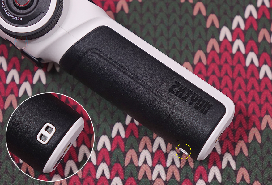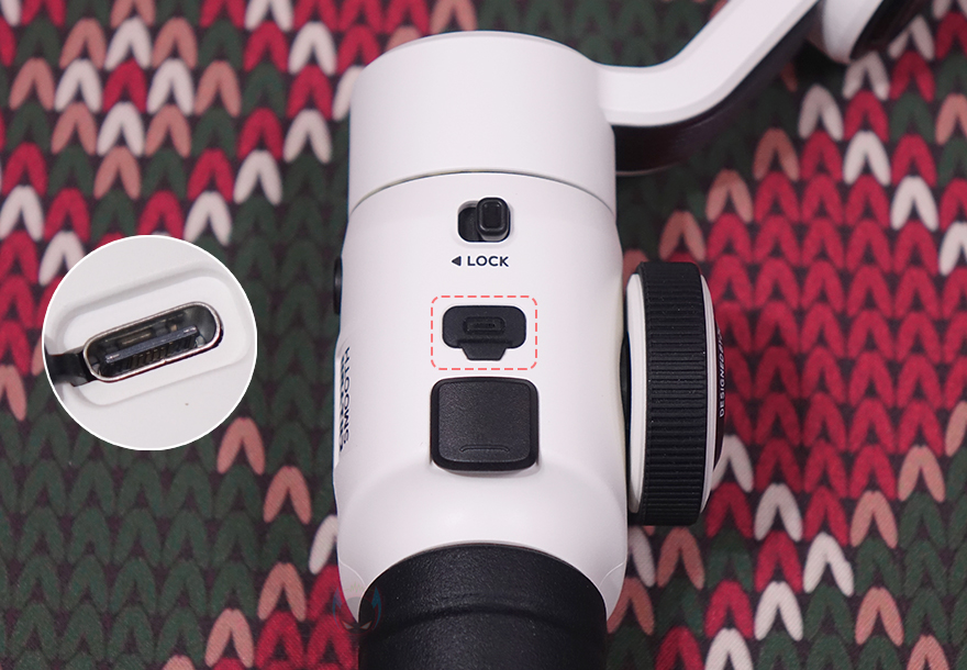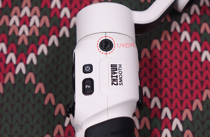 롤-축부분에는 틸트-축과 연결되는 암-부분을 길이조절할 수 있게 갖추고 있는데, 롤-축 바로 옆에 적용된 잠금 노브를 통해 줄이고 늘리고를 할 수 있습니다. 그리고, 롤-축 바깥 부분에는 ZHIYUN 이름을 한자로 새겨놨죠. 그리고, 팬 축 아래에 위치한 핸들 부분에는 전면에 조이스틱, 모드 버튼, 조명 버튼, 녹화 버튼, 표시등이 배치되어 있으며, 좌측에는 줌/포커스를 할 수 있는 컨트롤 휠, 우측에는 전원 버튼과 Fn 버튼 그리고 추가로 외부 액세서리 장비 및 장치를 장착할 수 있게 1/4인치 나사홀이 적용되어 있습니다. 또한, 후면에는 팬 축 잠금 스위치, 짐벌 충전 및 펌웨어 업그레이드 시 사용되는 USB Type-C 포트, 트리거 버튼이 배치되어 있죠. 참고로, SMOOTH 5S 짐벌 충전은 고속충전 15W와 10W 기본 충전 둘 다 지원하며, 배터리 용량은 2600mAh으로 짐벌만 사용했을 시 약 12시간 사용할 수 있습니다.
