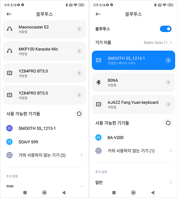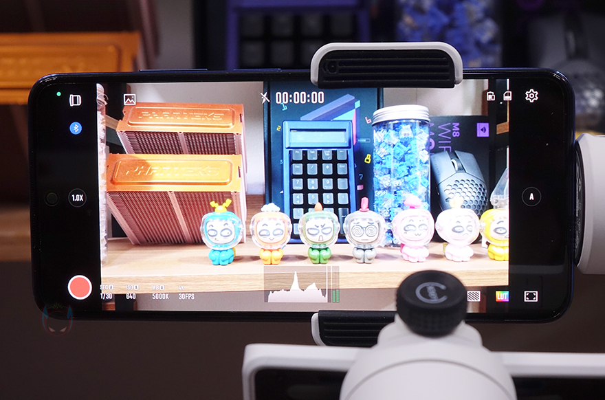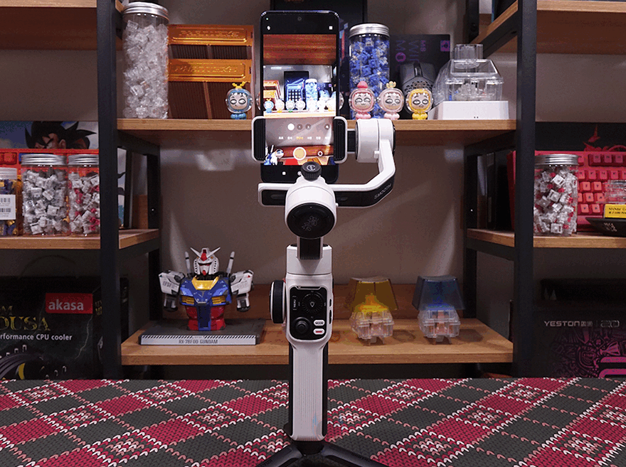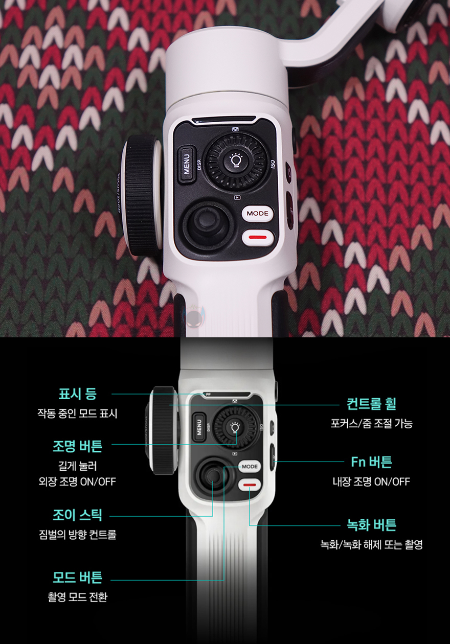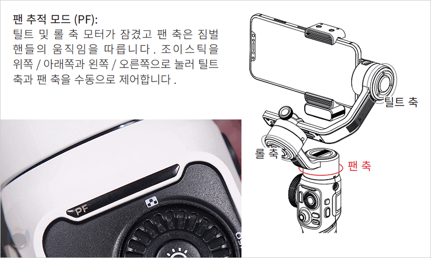 직접, ZHIYUN(지윤) SMOOTH 5S(스무스 5S) 짐벌을 사용해 보면, 앞서 언급했듯이 스마트폰이 장착되는 클램프는 90도 회전이 가능하기 때문에 가로/세로 모드로 촬영할 수 있으며, 전원을 켜면 자동으로 페어링모드가 시작되기 때문에, 스마트폰에서 블루투스 검색을 통해 SMOOTH 5S 짐벌을 연결해 주면 됩니다. 만약 블루투스 설정이 되지 않는다면, 우측에 있는 Fn 버튼을 5번 눌러서 재설정을 하면 됩니다. SMOOTH 5S 짐벌 역시 어플 지원으로 더 다양한 기능들을 편리하게 사용할 수 있게 지원하는데, 그전에 블루투스로만 기본 연결이 되어도, 조이스틱을 비롯한 조명, 녹화, 줌/포터스 휠 등의 직접 컨트롤할 수 있는 기능들은 바로 사용할 수 있습니다. 특히, SMOOTH 5S에서 새로 추가된 조명 같은 경우에는 5300K~5700K 색온도 범위를 가지고 있어서 그동안 짐벌에 추가로 조명을 장착해야 했던 불편함은 해소시켜 줍니다. 물론, 밝기조절도 조명버튼 주변에 있는 휠로 돌리면서 가능하죠. 참고로, 조명버튼을 끈 상태에서 주변 휠을 돌리면 스마트폰 자체의 촬영모드를 변경할 수 있습니다. 그리고, 모드 버튼을 통해서는 다른 짐벌 제품들처럼 3개의 축 변화에 따라 5가지 모드를 제공해주고 있으며, 사용자가 원하는 조건에 축 설정의 모드로 선택해서 사용하면 됩니다.