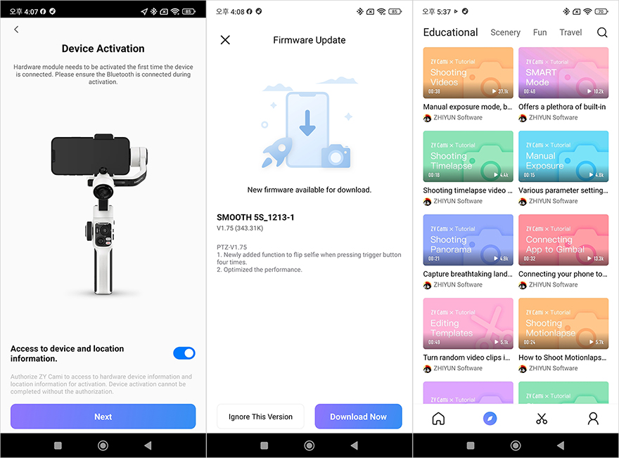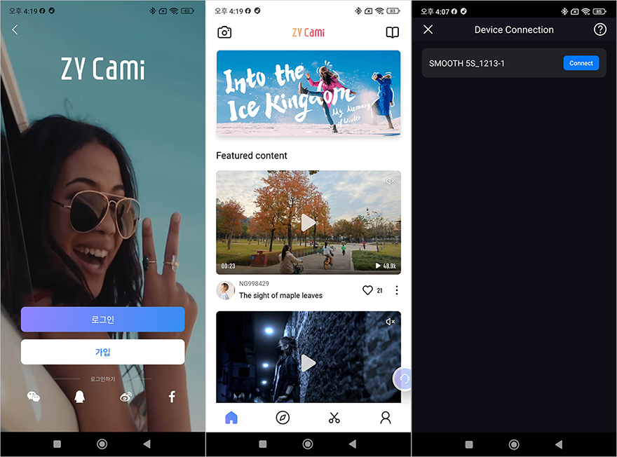 SMOOTH 5S 짐벌 역시 다른 짐벌 제품들처럼 앱(App) 지원을 해주고 있습니다. SMOOTH 5S 짐벌 같은 경우에는 2가지 앱을 사용할 수 있는데, 하나는 ZHIYUN 전용앱인 ZY Cami 앱으로 일단 앱과 연동하기 위해서는 회원가입이 필수이며, 연동은 블루투스 연결방식이라 큰 차이가 없어서 초보자도 쉽게 연결할 수 있으며, 펌웨어 업데이트도 앱을 통해 진행할 수 있습니다. 또한, 사용자들이 직접 만든 콘텐츠 공유 및 사용법 영상, 편집기능, 멤버십 기능도 담고 있으며, 촬영옵션 역시 기본 스마트폰 자체의 촬영옵션보다 더 다양하고, 짐벌 컨트롤 기능도 더 자연스러운 편이라 앱과 사용하길 추천합니다.