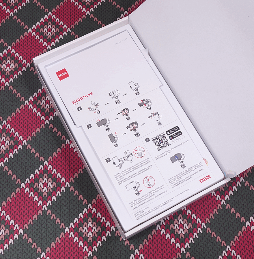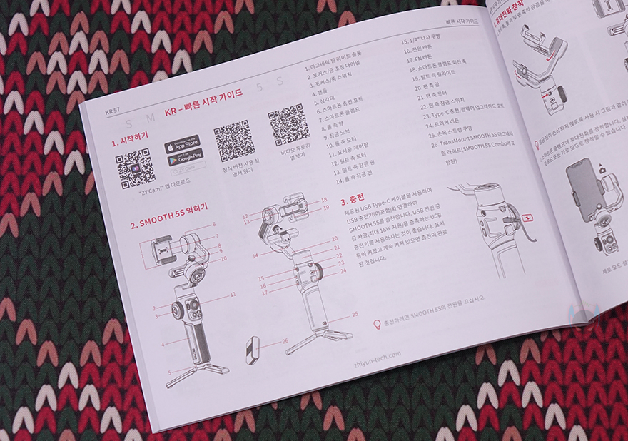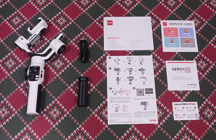 박스를 열어보면, 설명서 및 가이드를 제외한 SMOOTH 5S 짐벌, 삼각대는 기본 비닐 포장처리가 되어 있으며, 제품 구성은 SMOOTH 5S 짐벌, USB 충전케이블, 미니 삼각대, 제품 설명서, 퀵-가이드, 인증서들로 이루어져 있습니다. 국내 정식수입사인 (주)유쾌한생각을 통해 출시되었기 때문에, 설명서에는 한국어가 포함되어 있으며, 정품확인서도 제공해주고 있어서, 무상 1년 A/S 보장도 받을 수 있죠. 그리고, 사용 전에는 SMOOTH 5S 짐벌에 축 사이와 조이스틱 부분에도 스펀지 포장재가 있기때문에, 제거를 해야 합니다.