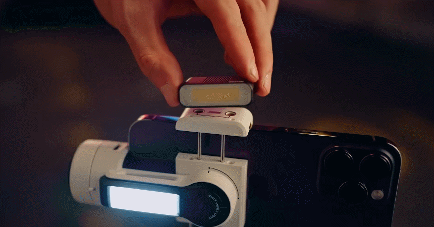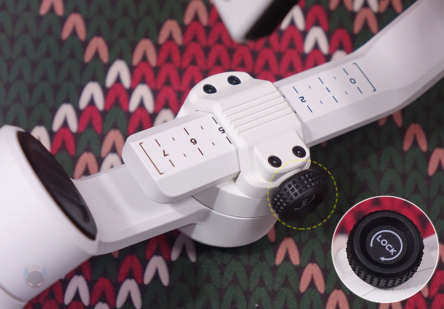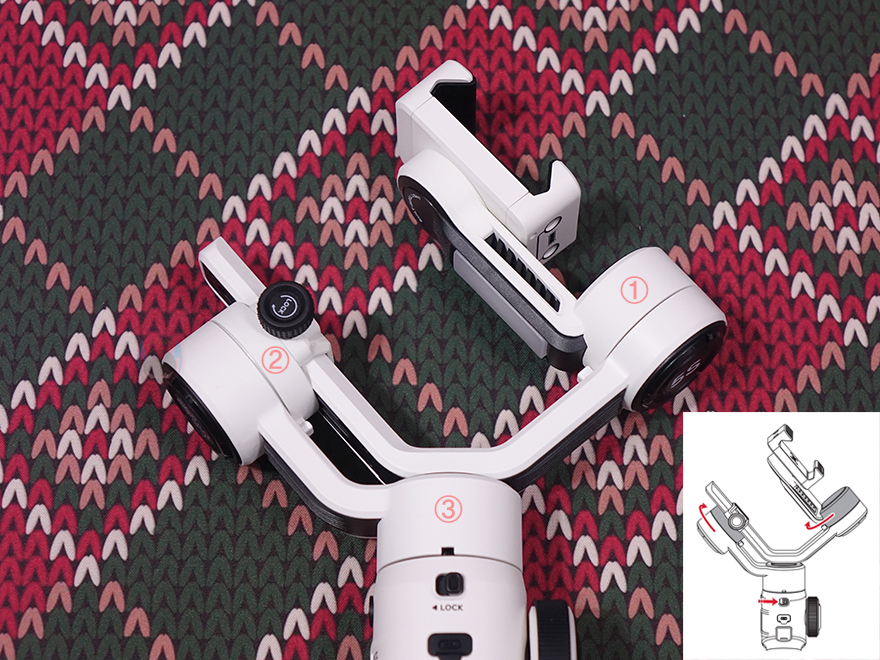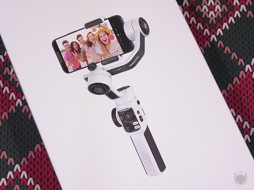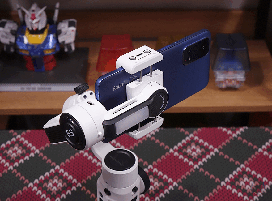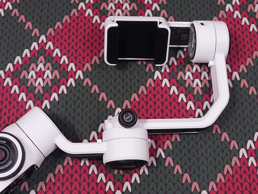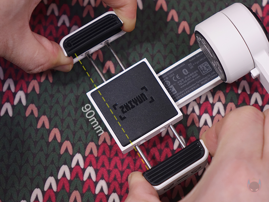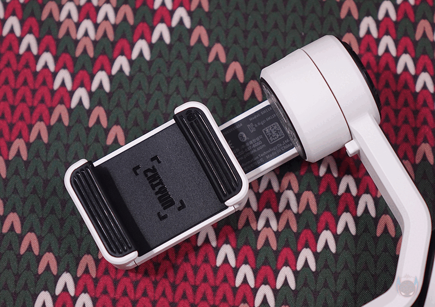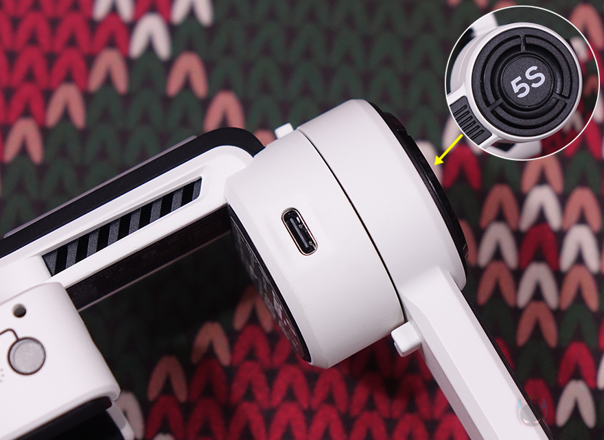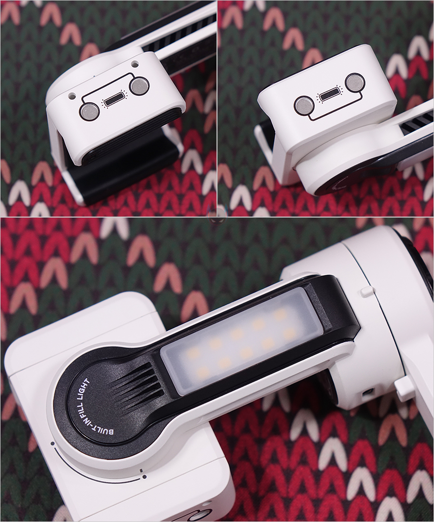 좀 더 자세히 SMOOTH 5S 짐벌을 살펴보면, 일단 리뷰에선 부위별로 살펴보기 위해 사용 전 3축 고정을 모두 풀었습니다. 먼저 틸트-축 부분에는 스마트폰이 장착되는 클램프에 적용되어 있는데, 90도 회전이 가능하고, 최대 90mm까지 벌릴 수 있습니다. 또한, 바로 이전 모델 SMOOTH 5처럼 클램프 양쪽 바깥쪽에는 마그네틱 방식의 조명장치(별도구매)를 장착할 수 있게 지원해주고 있죠. 그리고, 이전 모델에선 없었던 틸트-축과 클램프 연결부 암 후면에 내장 조명이 적용되었습니다. 디퓨저 디자인처리를 해놨지만, 내부에 LED가 10개 박힌 것을 외부 육안으로 쉽게 확인이 됩니다. 그리고, 틸트-축에는 스마트폰을 충전할 수 있게 USB Type-C 포트가 배치되어 있으며, 바깥쪽에는 모델명을 새겨놨죠.