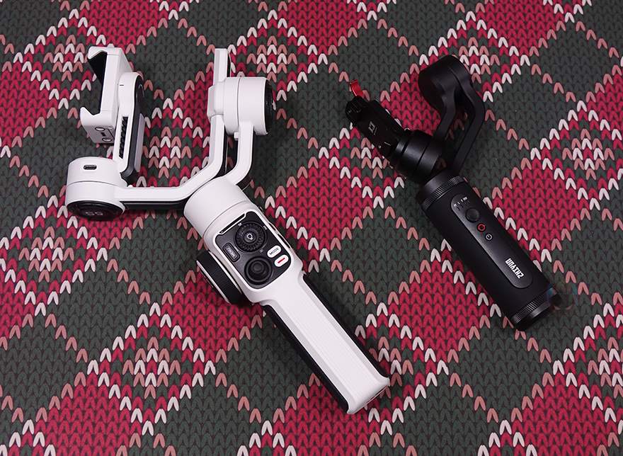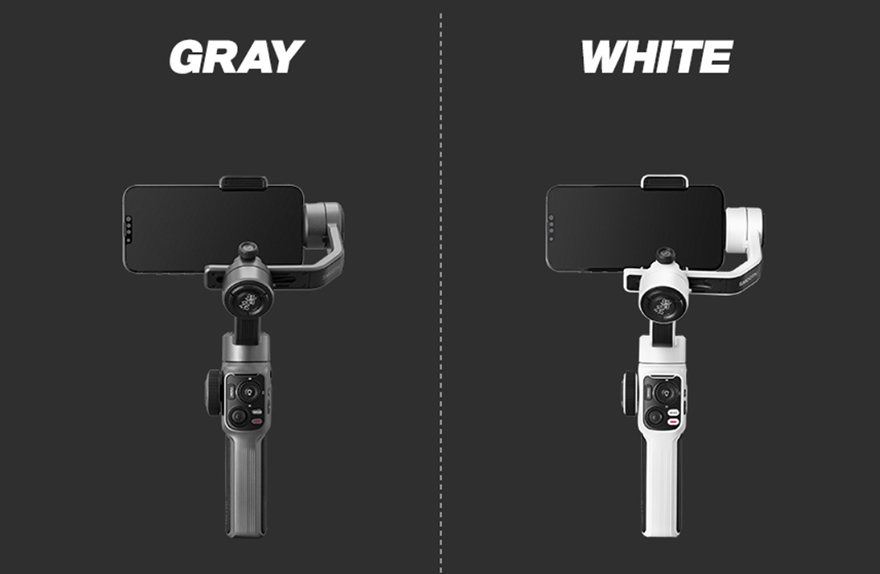 그럼, 본격적으로 ZHIYUN(지윤) SMOOTH 5S 짐벌을 살펴보는데, 일단 그동안 SMOOTH 시리즈는 1가지 색상으로만 출시되었는데, 이번에 처음으로 그레이와 화이트 2가지 색상으로 출시가 되었습니다. 그리고, SMOOTH 시리즈는 축에 따라서 크게 3가지 라인업으로 구분되는데, 3축은 SMOOTH, 2축은 SMOOTH Q, 1축은 SMOOTH X입니다. 물론, 3축인 SMOOOTH가 가장 최상급 모델이죠. 실제로 2축의 SMOOTH Q 라인업의 모델과 크기를 비교해 봐도 1축 차이가 있어서 큽니다. 물론, 각 라인업마다 특징이 있죠. 최상급인 SMOOTH은 3축이기 때문에 좀 더 안정적인 영상 촬영과 다양한 기능을 담고 있고, SMOOTH Q와 X는 축이 줄어드는 만큼 접을 수 있는 휴대성이 강조됩니다.