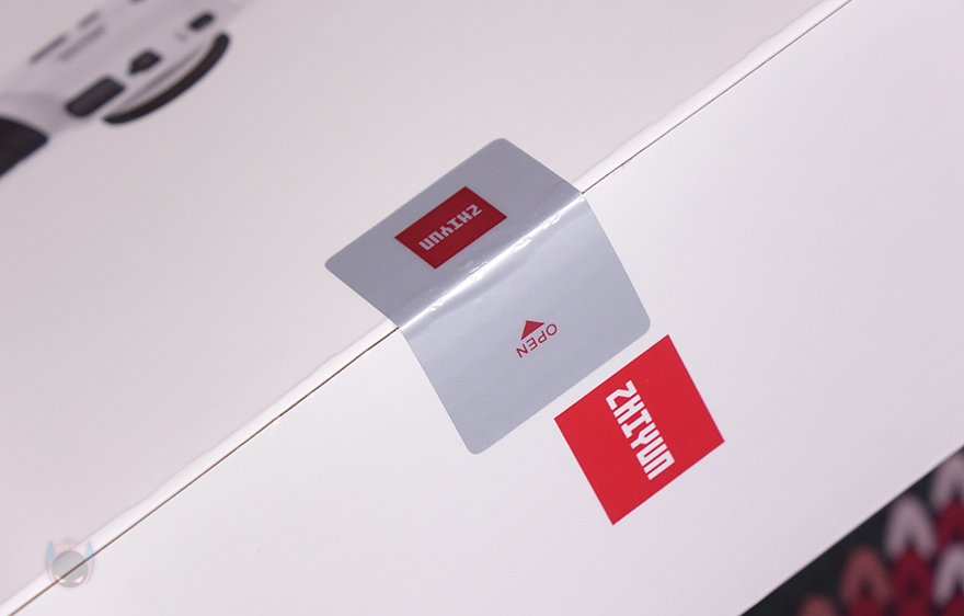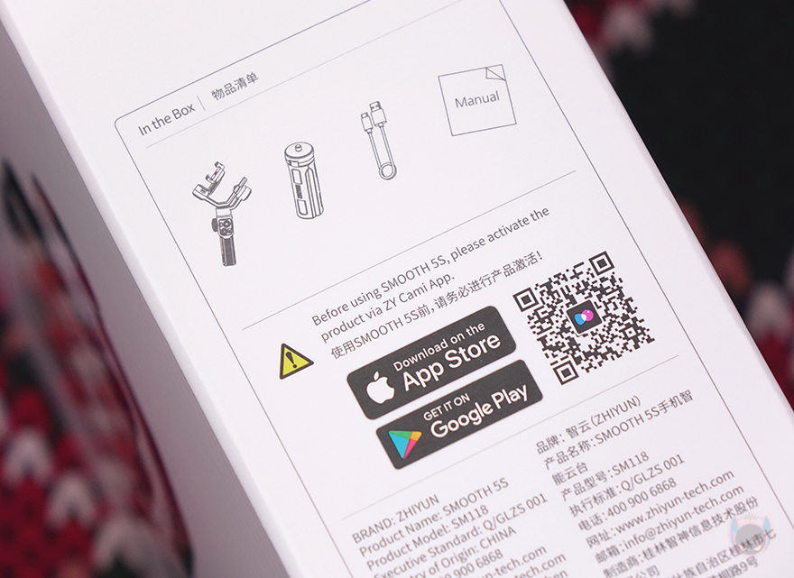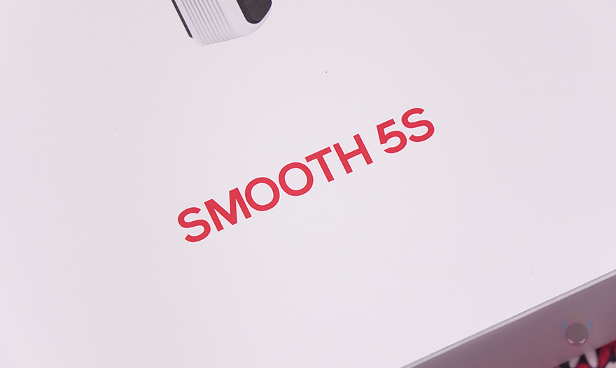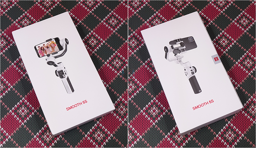 제품 패키지는 박스형태로 박스 전체까지 비닐밀봉처리가 되어있어서, 소비자입장에선 좀 더 판매제품에 신뢰할 수 있습니다. 그리고, 박스 전면과 후면에는 각각 SMOOTH 5S 짐벌에 스마트폰이 장착된 전후면 연출 이미지를 담고 있어서, 제품 디자인을 간접적으로 확인이 되죠. 또한, 박스 한쪽 측면에는 제품의 구성품 목록도 확인할 수 있으면, 반대쪽 박스 개봉 부분에는 동봉-씰(seal)도 부착되어 있습니다.