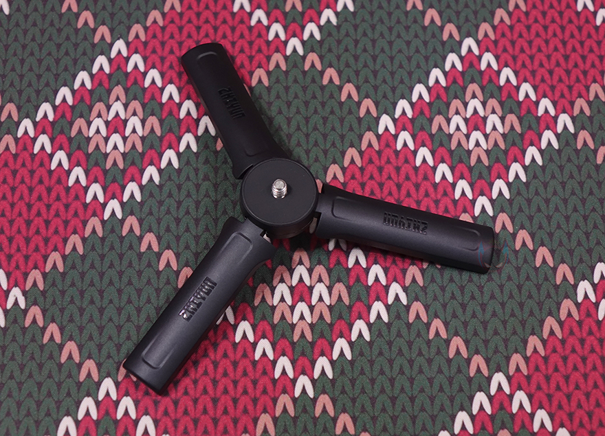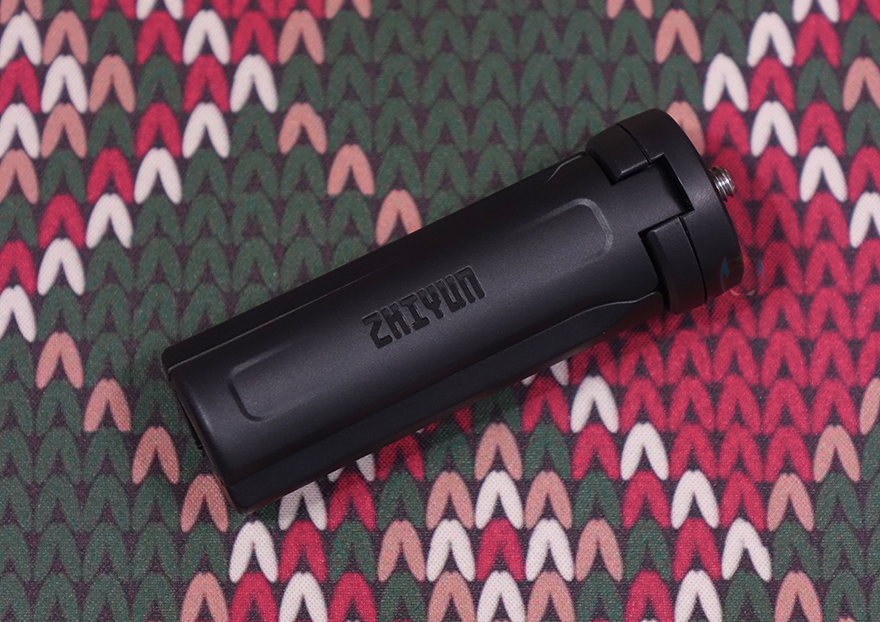 손잡이 역할의 핸들에는 그립과 접지력을 위해 후면을 제외한 전체를 고무 재질로 마감처리 했으며, 측면에 음각으로 ZHIYUN 브랜드 로고를 새겨놨으며, 전면 아래에는 손목 스트랩을 사용할 수 있게 홀-처리가 되어 있습니다. 그리고, 핸들 밑바닥 부분에는 함께 제공되는 미니 삼각대 또는 기타 장치 및 장비와 연결할 수 있게 1/4인치 나사홀이 처리되어 있죠. 함께 제공되는 미니 삼각대는 접고 펼칠 수 있는 형태라 기본적으로는 SMOOTH 5S 짐벌을 세울 때 사용하지만, 경우에 따라선 좀 더 손잡이 길이를 늘이는 막대 역할로도 사용할 수 있습니다. 끝으로, USB 충전케이블은 약 1m 길이에 USB Type-A to C 인터페이스를 갖추고 있습니다.