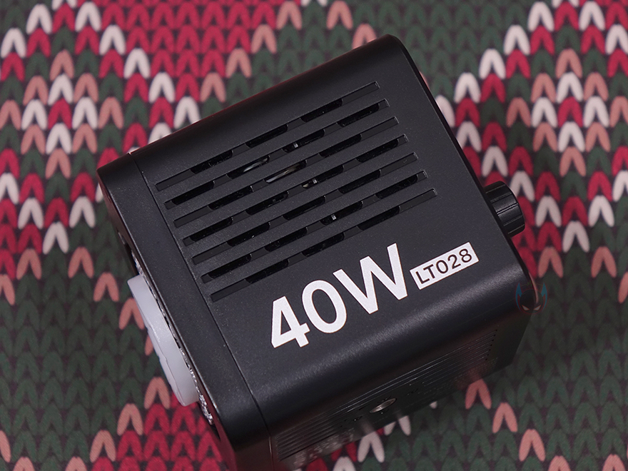 반사경을 분리한 상태에서 조명 본체를 살펴보면, 본체 한쪽 측면에는 모델명과 함께 앞서 제품박스에서 확인했던 최대 전력소모 40W 표기를 다시 확인할 수 있는데, COB 조명 제품 중에는 60W, 100W 그 이상도 있기 때문에 높은 편에 속하는 건 아닙니다. 물론, COB 조명 특성상 발열이 생기기 때문에 앞서 전면에 확인한 COB LED 주변 방열판 외에도 본체 측면마다 발열이 배출될 수 있도록 에어홀 처리도 적용되어 있죠. 그리고, 밑바닥에도 에어홀 처리가 되어있으며, 간략한 기본 사양표기와 함께 삼각대 같은 거치대에 장착할 수 있도록 1/4인치 나사홀이 중앙에 적용된 것을 확인할 수 있습니다. 참고로, 기본 사양에 표기된 것처럼 내부에는 3400mAh 용량의 배터리가 내장되어 있는데, 이는 현재 충전식 COB 조명 제품 중에서는 대용량에 속하는 용량입니다.